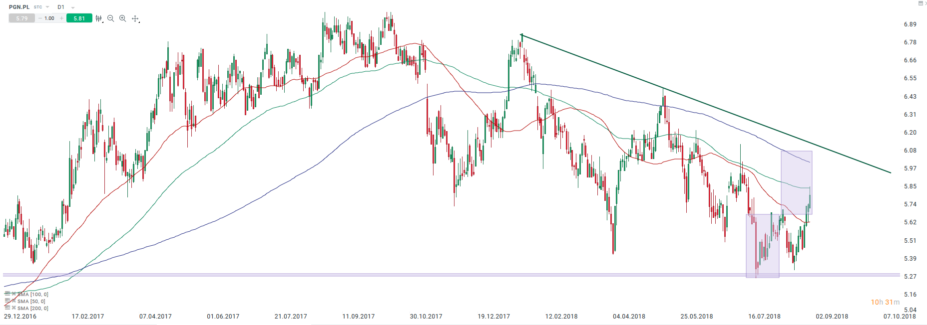 PGNIG (PGN.PL) po obronie wakacyjnych minimów kieruje się wyżej. Dzisiejsze wzrosty zatrzymały się na średniej 100-sesyjnej. Źródło: xStation5.