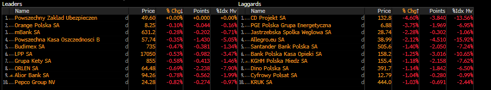 W indeksie WIG20 spółki notują dziś na razie same spadki. Sam indeks traci dziś ponad -1%. Najmocniejszą przecenę widać (poza CD Projektem) na akcjach PGE (-3,75%), JSW (-2,28%) oraz Allegro (-2%). Mocne straty widać także na mWIG40 (-1%) oraz sWIG80 (-0,8%).