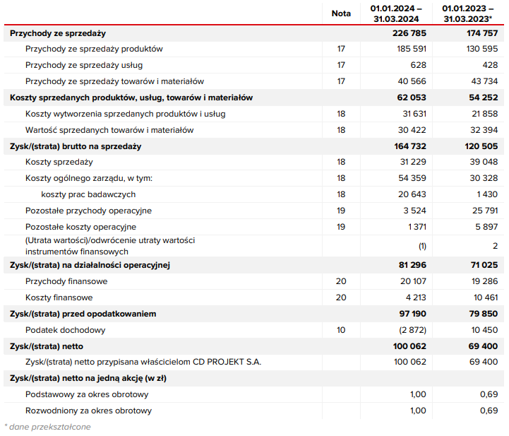 - CD Projekt (CDR.PL) zaraportował wyniki za 1Q24. Spółka osiągnęła mocną dynamikę przychodów (+30% r/r), a także solidne wzrosty na poziomie zysku operacyjnego (+13% r/r) oraz zysku netto (+44% r/r). Wyniki finansowe wskazują na mocną kondycję spółki, szczególnie po uwzględnieniu wzrostu w bilansie inwestycji krótkoterminowych. Tym samym CD Projekt wydaje się dobrze przygotowany do pracy nad nadchodzącymi projektami. Mimo to warto zauważyć, że prawdziwy potencjał spółki drzemie w wydawanych sporadycznie dużych tytułów, a na razie na projekt Polaris (najnowszą grę z serii wiedźmińskiej) przyjdzie czekać najprawdopodobniej kilka lat. Stąd wzrosty, które ostatnio widzieliśmy na kursie akcji, nie miały mocnych podstaw fundamentalnych, a po publikacji raportu widzimy na kursie realizację zysków. Spadki zepchnęły kurs na poziomy sprzed 2-tygodniowych wzrostów.