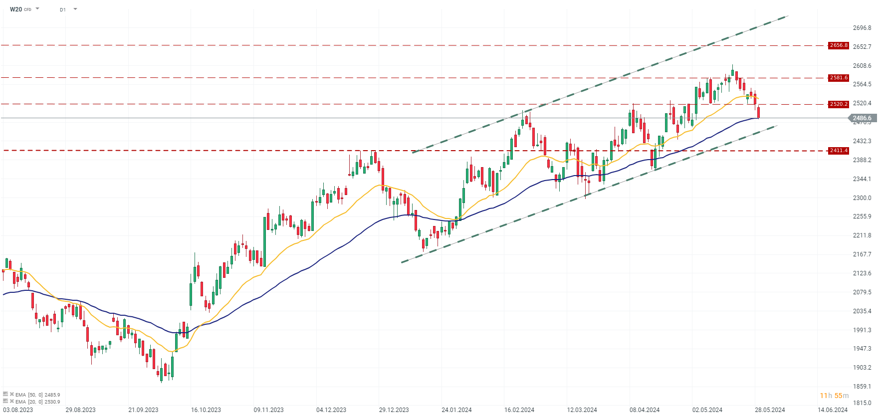 Kontrakt na indeks WIG20 (W20) kontynuuje korektę. W średnim horyzoncie spadki dalej utrzymują się w granicach kanału trendu wzrostowego, jednak cena zaczyn się już do niego zbliżać. Warto zwrócić uwagę na poziomy w okolicy 2470 pkt., które mogą okazać się wsparciem kanału dla notowań kontraktu. W krótkim horyzoncie ostatnia zwyżka, jaką widzieliśmy na notowaniach kontraktu, została już przełamana, a cena zmierza teraz z powrotem w kierunku ograniczeń trendu bocznego z lutego i marca. Teraz na poziomie 2484,9 pkt. kontrakt znajduje wsparcie na wykładniczej średniej kroczącej. Jeżeli notowania dalej będą spadać, przecięcie średniej może stanowić dodatkowy sygnał dla niedźwiedzi. Źródło: xStation.