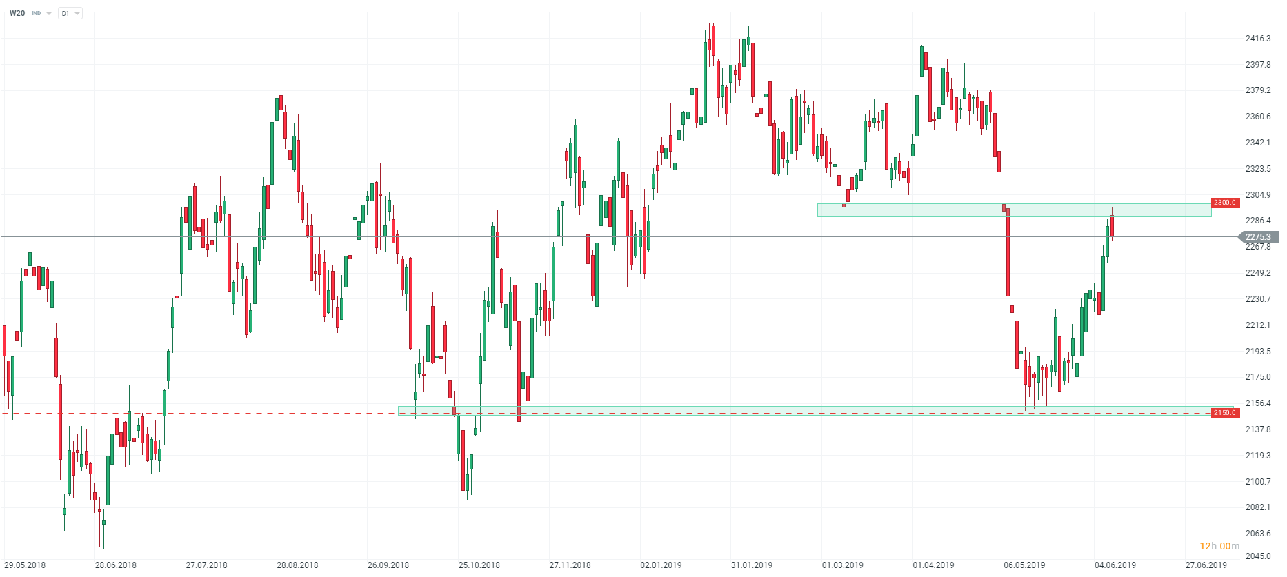 Na początku poniedziałkowej sesji widać wyraźne wzrosty na światowych parkietach. Zyskuje również WIG20. Co prawda początkowe wzrosty zostały szybko zniesione, niemniej do końca sesji jest jeszcze sporo czasu i być może indeks ponownie wyjdzie na plus. Jednak patrząc technicznie, cena dotarła do strefy oporowej, która wynika z dołków z 8 marca. Z tego samego poziomu mogliśmy także obserwować dynamiczne spadki na początku maja. Dlatego też należy uważać na ewentualną korektę spadkową. Większe wzrosty powinny się pojawić dopiero po przekroczeniu poziomu 2300 pkt.