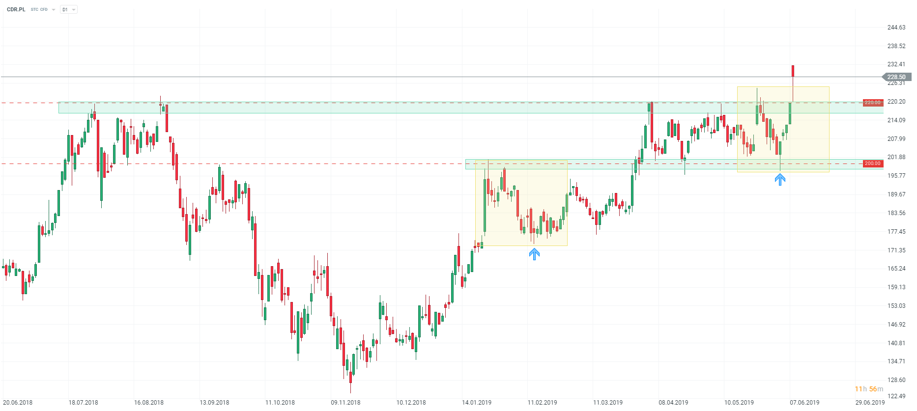 Na szczególną uwagę zasługuje dziś CD Projekt (CDR.PL). Zwiastun najnowszego tytułu "Cyberpunk 2077” został zaprezentowany na konferencji Microsoftu, spółka chwali się również trailerem na swoim Twitterze. Najnowsza gra ma trafić do sprzedaży 16 kwietnia 2020 roku. Jak widać inwestorzy są zadowoleni, kurs akcji rośnie dziś ponad 4%. Tym samym akcje znalazły się na historycznych szczytach. Patrząc na sytuację techniczną wsparciem jest w tej chwili w strefa przy 220 zł za jedną akcję. Dopóki cena znajduje się powyżej, nie ma mowy o większych spadkach. Warto też zwrócić uwagę na to, że w ostatnim czasie rynek wykonał dwie niemal identyczne korekty - układy zaznaczone żółtymi prostokątami.