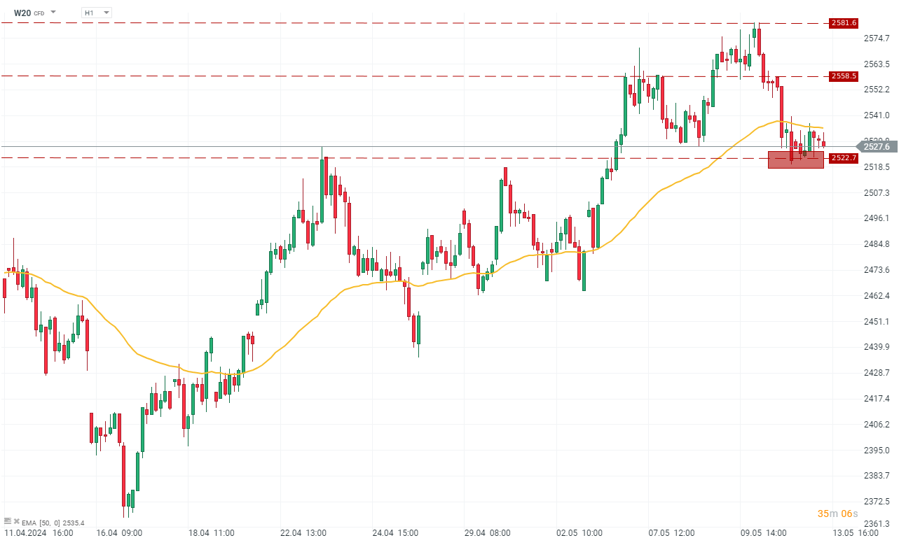Kontrakt na indeks WIG20 (W20) wszedł na początku tygodnia w interwale 1H w okres lekkiej konsolidacji na poziomach w ok. 2520-2530 pkt. Tym samym po przebiciu w piątek wskaźnika EMA50 w tym ujęciu pozostaje pod presją podażową. Wydaje się, że na razie mocnym oporem indeksu będzie poziom 2522,7 pkt., na którym na razie notowania się zatrzymały. Jeżeli jednak niedźwiedzie nastroje przeważą możemy spodziewać się ruchu najpierw w okolice 2518,5 pkt, a potem pierwszym kolejnym mocnym poziomem wsparcia będą granice 2496,1 pkt. Natomiast na rynku nie widać na razie nastrojów spychających kurs kontraktu w te rejony. Źródło: xStation