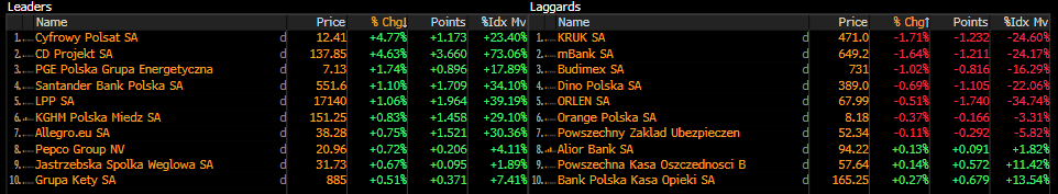 Przyglądając się sektorom, możemy zauważyć, że dominację na dzisiejszej sesji prezentuje WIG-Gry, pchany mocnymi wzrostami CD Projektu. Indeks rośnie dziś o 3,36%. Pozytywne nastroje widać także wśród innych spółek z IT na polskim rynku. WIG-Informatyka notuje 1,94% wzrost, a najmocniej rosnącymi spółkami są Vercom (+5,08%) oraz Passus (+4,51%). Jedynymi sektorami ze stratą na dzisiejszej sesji są sektory związane z budową: WIG-Budowa traci -0,39%, a WIG-Nieruchomości trzyma się w okolicach ceny zamknięcia z poprzedniego dnia.