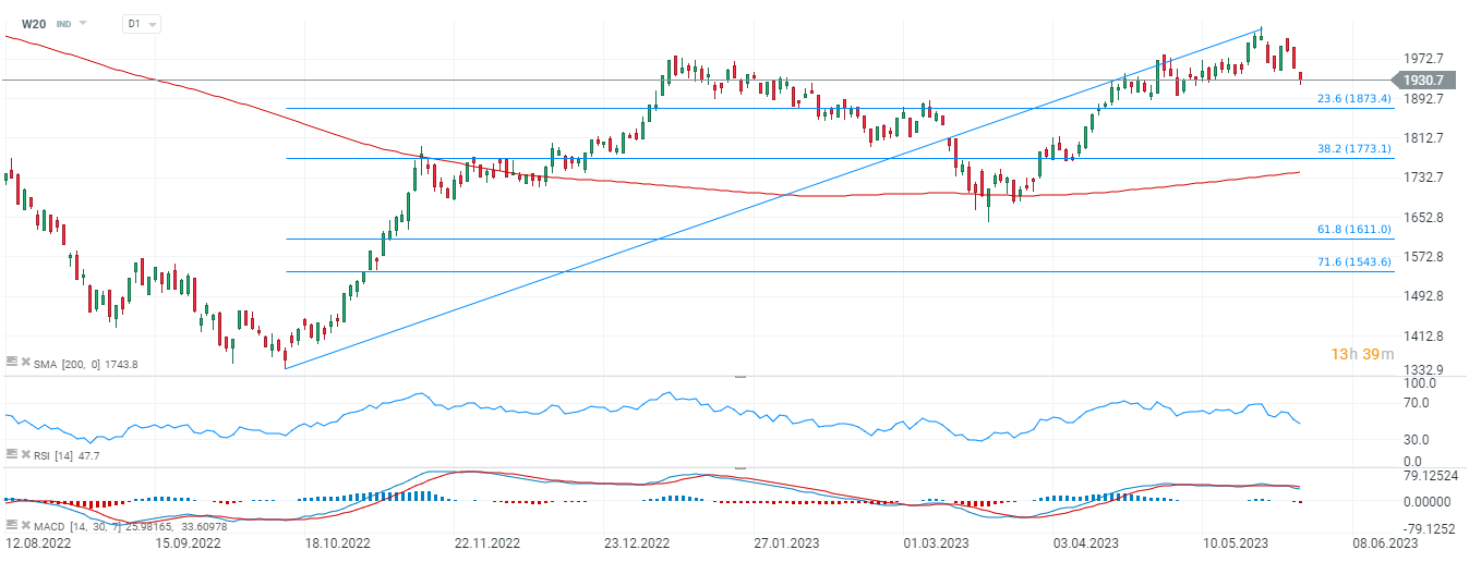 Wykres notowań kontraktów opartych o indeks WIG20 (W20), interwał D1. RSI cofa się poniżej neutralnych poziomów a MACD wskazuje na niedźwiedzią formacje przecięcia. Jeśli spadki przyspieszą istotnym poziomem może być 1880 pkt, gdzie widzimy 23,6 zniesienie Fibonacciego fali wzrostowej z jesieni 2022 roku. Na tych poziomach znajduje się też 38,2 zniesienie Fibonacciego fali wzrostowje zapoczątkowanej w lutym. Źródło: xStation5