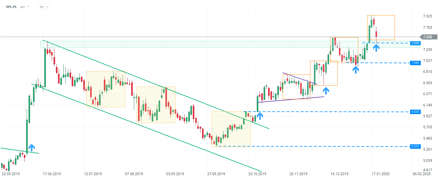 Z kolei jedną z najgorzej radzących sobie dziś spółek jest Orange Polska (OPL.PL), tutaj również nie pojawiły się żadne istotne informacje mogące sugerowąc spadki. Dlatego też dzisiejszy ruch do dołu należy traktować jako korektę po ostatnich solidnych wzrostach. Patrząc na wykres należy zauważyć, że pomimo spadków, notowania odbijają dziś od kluczowej strefy wsparcia, która wynika nie tylko z wcześniejszych reakcji ceny, ale także z dolnego ograniczenia układu Overbalance. Biorąc pod uwagę falę wzrostową, trwającą od października 2019 roku, największą korektą jest układ zaznaczony kolorem pomarańczowym. Dopóki struktura nie zostanie zanegowana, zgodnie z metrologią obowiązuje trend wzrostowy.