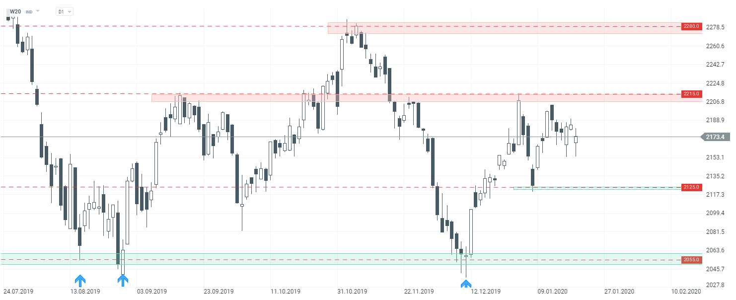 Sytuacja na W20 nie uległa zmianie, pomimo dzisiejszego cofnięcia kurs wciąż porusza się w szerokiej konsolidacji. Kluczowe wsparcie wypada przy 2125 pkt, a opór przy 2215 ptk. Źródło: xStation5