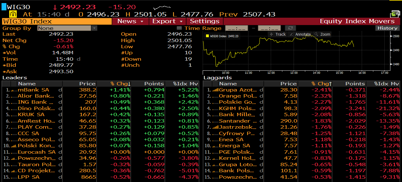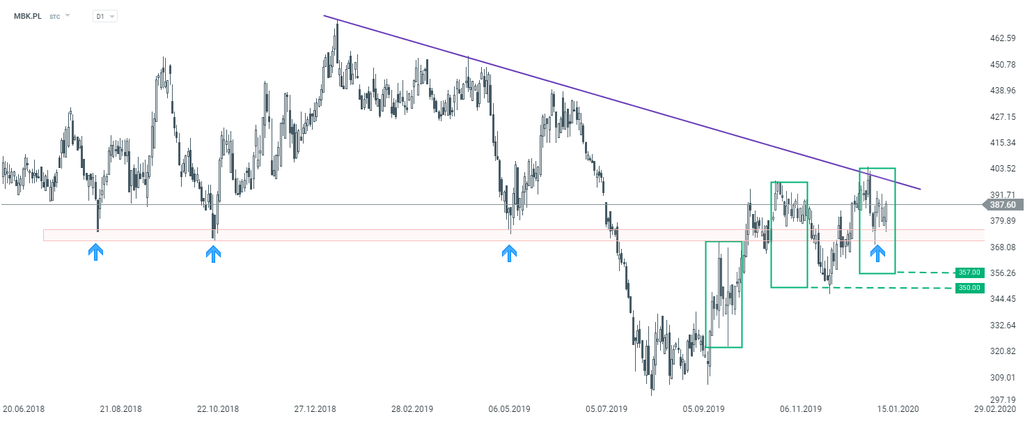 Podczas dzisiejszej sesji pozytywnie wyróżnia się mBank. Pomimo, że dziś nie poznaliśmy żadnych kluczowych komunikatów ze strony banku, kurs ponownie odbił się od kluczowej strefy wsparcia wypadającej w rejonach 375 zł. Jedyny komunikat jaki pojawił się ze strony Mbanku to informacja o płatnościach Garmin pay, “nowa usługa ma być dostępna dla wszystkich klientów, którzy są posiadaczami zegarka Garmin z funkcją NFC”. Jednak w przypadku sektora bankowego trzeba pamiętać o ciągnącym się temacie kredytów frankowych, wczorajsze spadki na spółce były związane z oceną agencji Moody’s, która uważa, że rezerwy związane z portfelem kredytów walutowych obniży rentowność banków w IV kwartale 2019 roku, co w konsekwencji wpłynie negatywnie na ocenę kredytową między innymi Mbanku. Technicznie kurs utrzymuje się jednak powyżej wspomnianej strefy wsparcia przy 375 zł, niewykluczony jest więc ponowny atak na linię trendu prowadzoną po ostatnich wierzchołkach.
