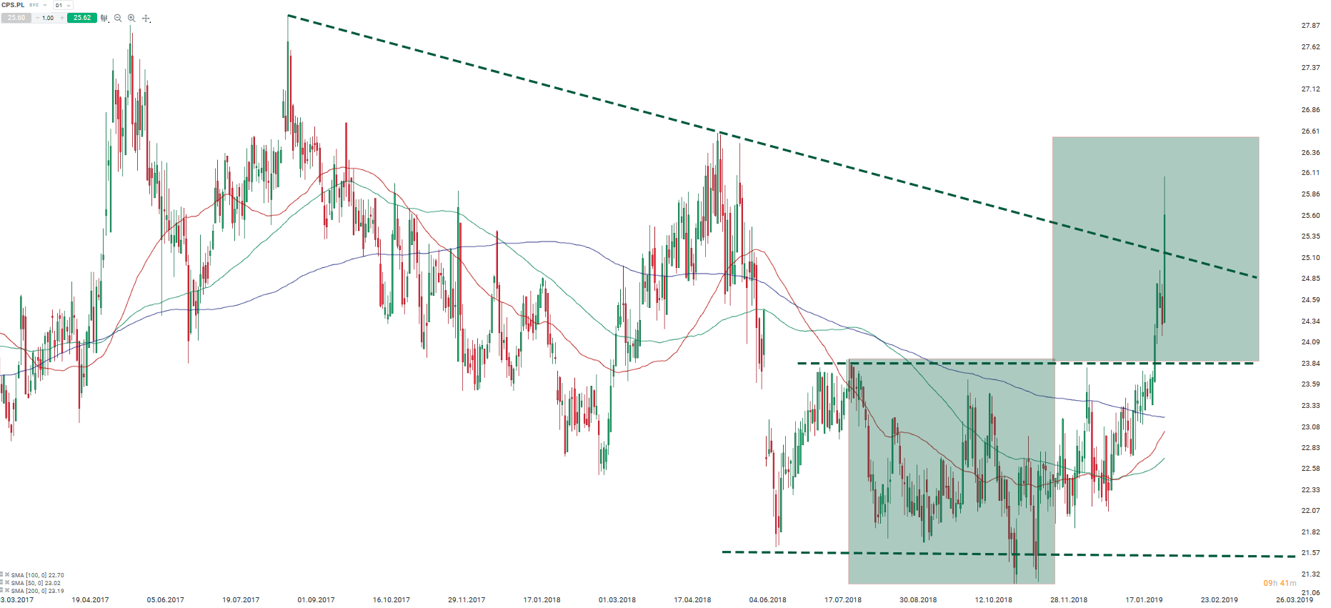 Cyfrowy Polsat zbliża się do realizacji potencjalnego zasięgu wybicia z formacji prostokąta oraz wybija spadkową linię trendu. Źródło: xStation5.