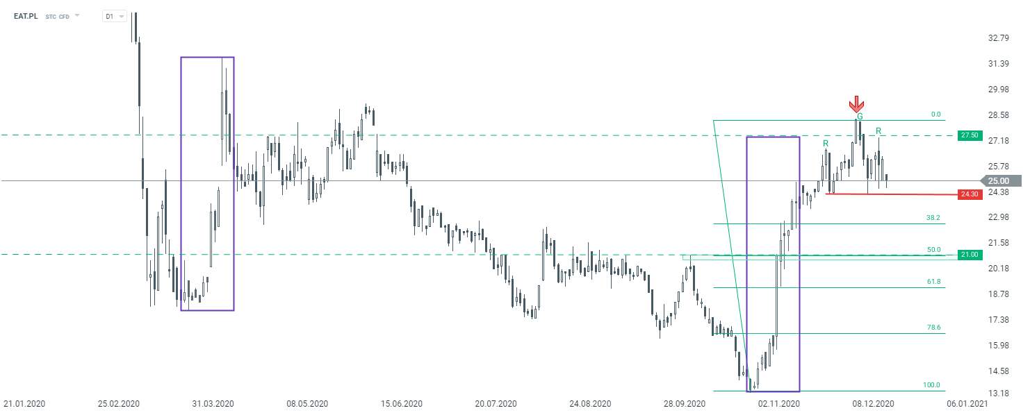 W dzisiejszej analizie przyjrzymy się sytuacji technicznej na AmRest Holdings SE (EAT.PL), gdzie obserwujemy ponad 4% przecenę. Ruch w górę, który został wywołany euforią co do szczepionki na koronawirusa, wyraźnie wyhamował, a weekendowe doniesienia z Wielkiej Brytanii studzą rynkowy optymizm. Patrząc na interwał dzienny, notowania dotarły w ostatnim czasie do kluczowego oporu przy 27,5 zł, wynikającego z szerokiej geometrii 1:1.Zgodnie z założeniami metodologii Overbalance, istnieje więc szansa na dalszą przecenę. Za spadkami przemawia również budująca się formacja głowy z ramionami. Spadki mogą przyspieszyć po pokonaniu linii szyi, która wypada w rejonach 24,30 zł. Scenariusz spadkowy zostanie zanegowany po wyjściu powyżej maksimów ustanowionych 9 grudnia.