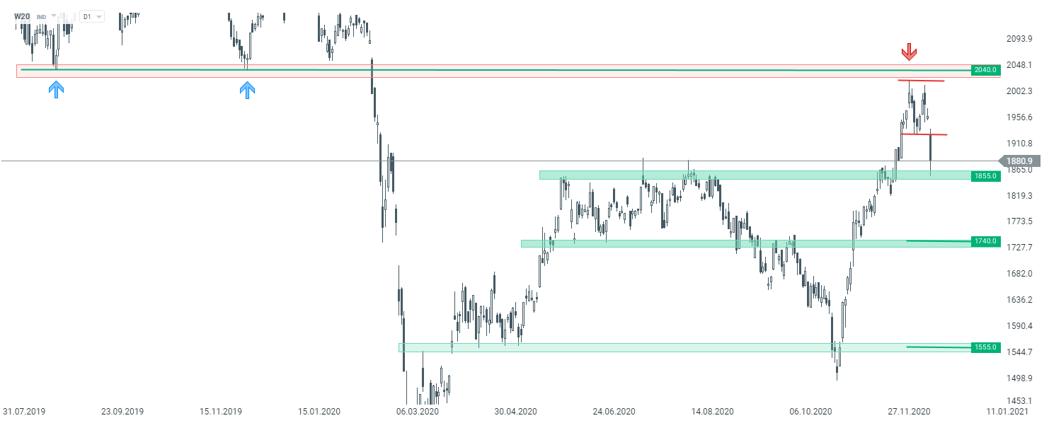 Patrząc z kolei na sytuację techniczną na indeksie dwudziestu największych spółek WIG20 (W20), możemy obserwować solidne spadki. Pod koniec ubiegłego tygodnia doszło do utworzenia się lokalnej formacji podwójnego szczytu, a dziś po wybiciu linii szyi układu przecena przyspieszyła. Niemniej warto zauważyć, że pomimo spadkowego sygnału z klasycznej analizy technicznej, doszło do wyhamowania wyprzedaży na wysokości horyzontalnej strefy wsparcia. Okolice 1855 pkt pozostają więc kluczową podporą dla kupujących i jeżeli ma dojść do głębszej korekty w kierunku 1740 pkt, poziom ten musiałby zostać pokonany.