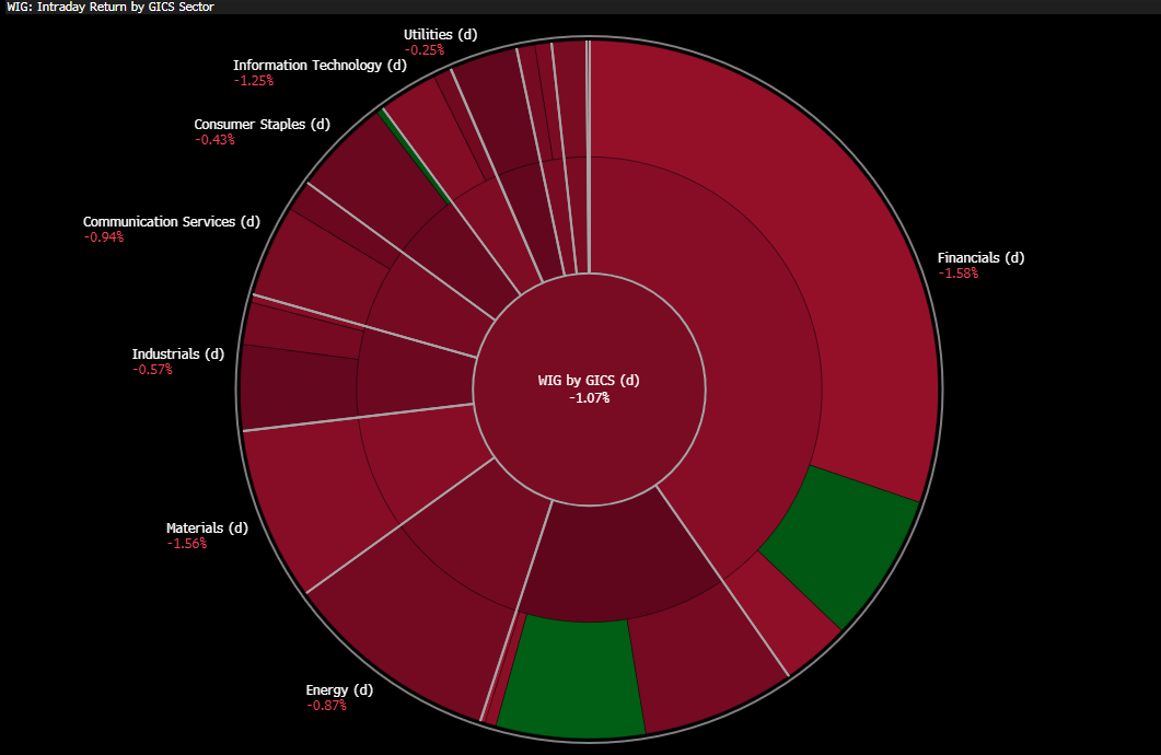 Polska giełda przeżywa dzisiaj mocniejszą korektę. Indeks WIG20 traci dziś -1,11%, a szeroki indeks WIG obniżył się o -1,07%. Wśród sektorów przodujących w spadkach przede wszystkim wyróżniają się banki i sektor finansowy, które dzisiaj jak na razie straciły -1,58%. Wśród czołowych banków najmocniejszy spadek odnotował ING Bank Śląski, co było jednak spowodowane odcięciem dywidendy. Poza korektą dywidendową spółka traci dalej ok. -1,52%.
