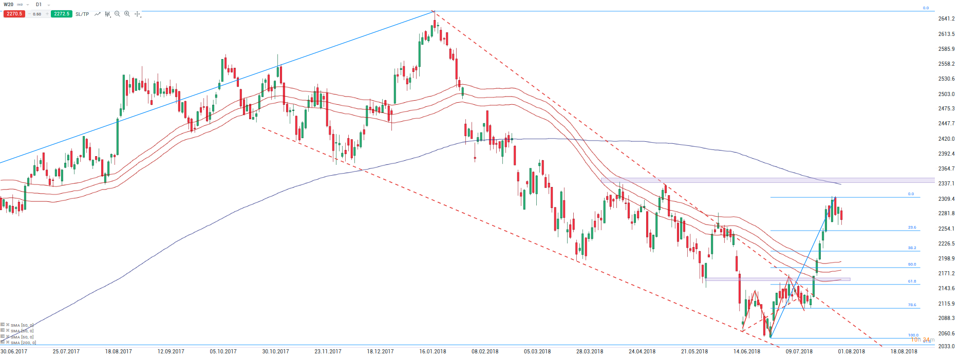 W ujęciu technicznym pomimo silnych spadków, średnioterminowy obraz nie ulega zmianie. Pierwszym poziomem wsparcia powinny być okolice 23,6% zniesienia ostatniej fali wzrostowej, które zlokalizowane są na poziomie 2250 pkt. Jeżeli te poziomy zostaną przełamane to droga do poziomu 2200 pkt. pozostanie otwarta. W tych rejonach znajduje się kanał średnich 50-sesyjnych oraz niewiele niżej znajduje się także zniesienie 50% ostatniej fali wzrostowej.