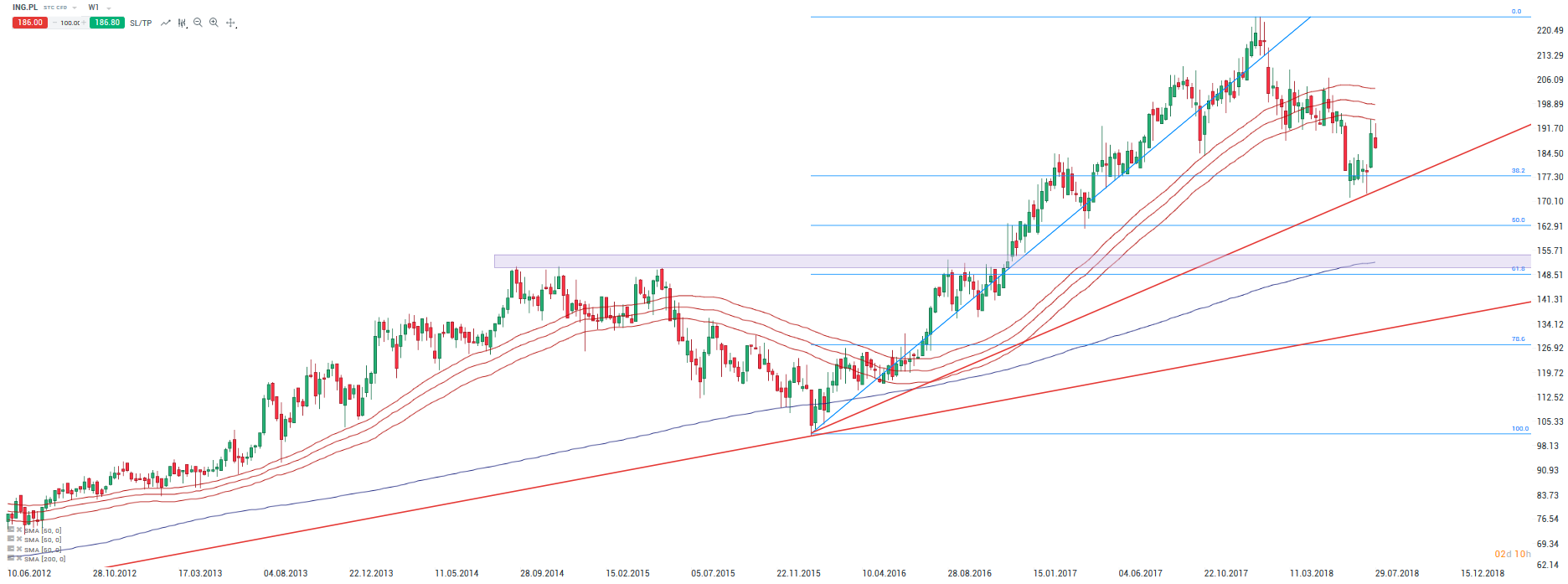 Na wykresie tygodniowym kurs akcji ING (ING.PL) odbija się od kanału średnich 50-okresowych. Przecenę w poprzednich tygodniach zatrzymało zniesienie 38,2% fali wzrostowej od początku 2016 roku. Jeżeli tegoroczne minima zostaną wyłamane, to możliwe jest zejście nawet do poziomu 150 zł., gdzie znajduje się obecnie średnia 200-tygodniowa, zniesienie 61,8% wspomnianej fali wzrostowej i lokalne szczyty z 2014 oraz 2016 roku. Źródło: xStation5.