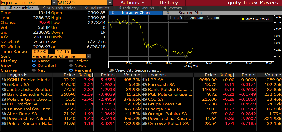 Wśród blue chipów mamy dzisiaj komplet czerwieni. Najmocniej trzyma się Eurocash (EUR.PL), który po spadkach, który próbuje odbijać z okolic minimów z 2011 roku. Najgorzej radzi sobie KGHM (KGH.PL), któremu nie pomagają spadki na rynku miedzi. Źródło: Bloomberg.