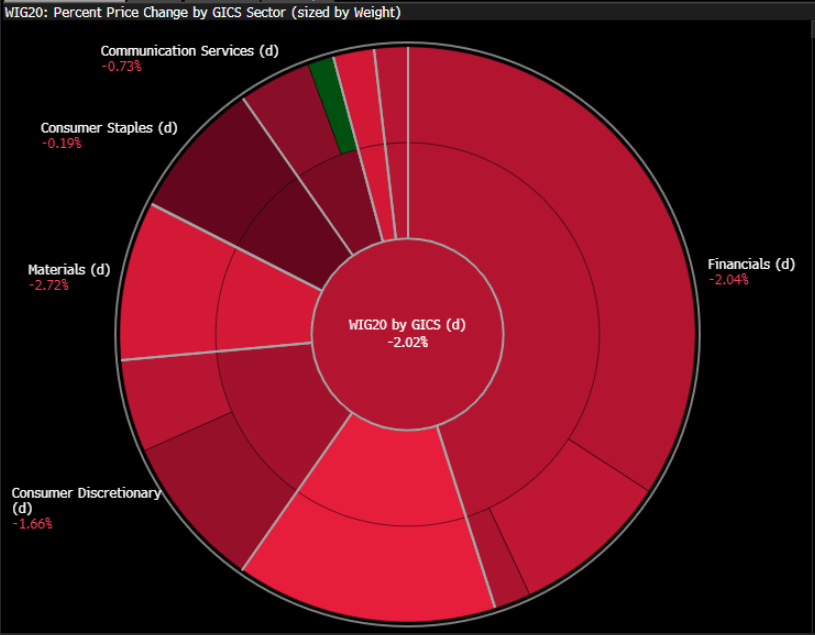 - Warszawska giełda wyraźnie traci pod koniec tygodnia – WIG20 spada o niemal 2% do okolic 2 900 pkt, a pozostałe główne indeksy (WIG, mWIG40, sWIG80) również pogłębiają korektę.
