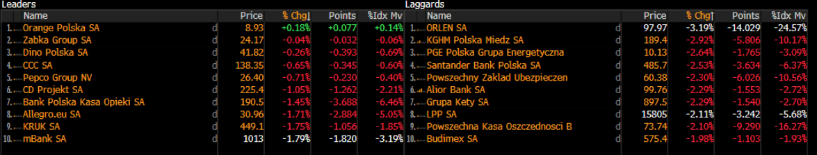 Największe spadki obserwowane są w przypadku dużych spółek. KGHM Polska Miedź S.A. traci 2,9 procent, PKN Orlen S.A. ponad 3 procent, a Cognor Holding odnotowuje aż 22 procent spadku, stając się jedną z najsłabszych spółek na szerokim rynku.