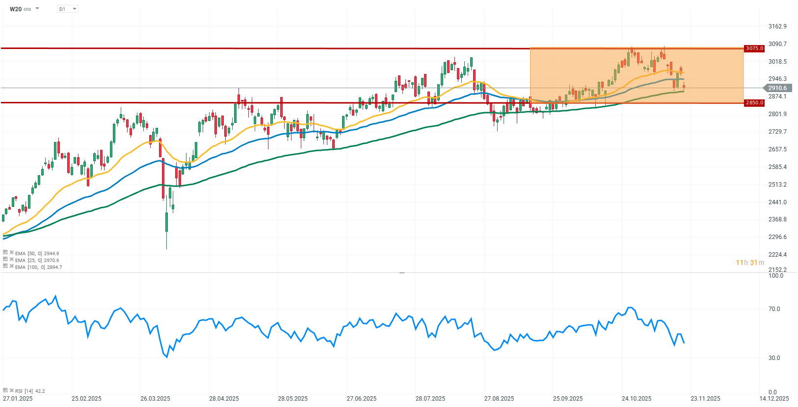 Dzisiejsze notowania kontraktów na indeks WIG20 przebiegają pod wyraźną presją sprzedaży, a kurs oscyluje w okolicach 2910 punktów. Strona podażowa zdecydowanie zyskała przewagę i obecnie dyktuje warunki na rynku. Kluczowym poziomem technicznym pozostaje 100-dniowa wykładnicza średnia krocząca (kolor zielony), która stanowi ostatnią wyraźną barierę chroniącą przed pogłębieniem korekty. Wskaźnik RSI (14) obniżył się do około 42, co wskazuje na wyraźne osłabienie momentum popytowego, choć nadal nie sygnalizuje wejścia w strefę wyprzedania (poniżej 30). Aczkolwiek spadkowa tendencja RSI potwierdza narastające pogorszenie nastrojów rynkowych i zwiększa ryzyko kontynuacji zniżki.