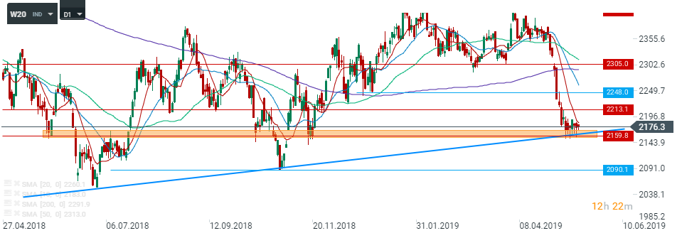 WIG20 (W20) znajduje się w okolicach kluczowego poziomu 2160 pkt, który zbiega się z długoterminową linią trendu. Źródło: xStation5