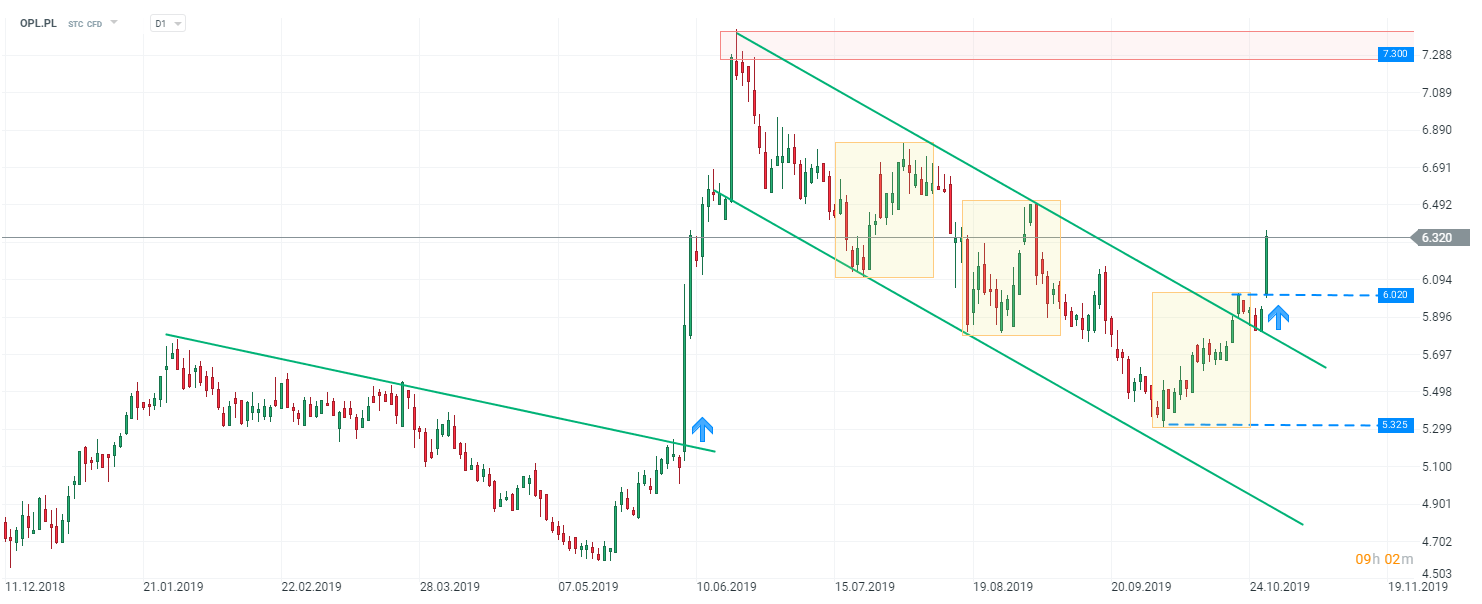 Spośród największych spółek najlepiej radzi sobie dziś Orange Polska, akcje rosną we wtorek ponad 6%. Ruch ten jest spowodowany przez dużo lepsze wynik kwartalne. W komunikacie możemy przeczytać, że zysk netto w 3 kw. 2019 roku wyniósł 224 mln zł. Jak powiedział prezes spółki: "Orange Światłowód dotarł już do 4 mln domów i mieszkań w całej Polsce. Widzimy, że klienci doceniają zalety superszybkiego internetu i chętnie się na niego decydują. W minionym kwartale usługę wybrało 39 tys. nowych klientów. Coraz więcej klientów wybiera abonamentowe usługi mobilne, a nasi dotychczasowi klienci chętniej zostają w Orange. To przełożyło się na najlepszy wynik w tym segmencie od 2 lat.”Jeśli chodzi natomiast o sytuację techniczną, ruchu w górę można było się spodziewać. Notowania już wcześniej wybiły się z kanału spadkowego, a po reteście i publikacji raportu kwartalnego kurs ruszył dynamicznie w kierunku północnym. Zgodnie z klasyczną analizą techniczną , droga do poziomu 7,3 zł jest otwarta. Wczęsniej oczywiście znajdują się opory, wynikające z lokalnych szczytów niemniej biorąc pod uwagę obecną dynamikę, mogą one zostać z łatwością pokonane. Dopóki cena znajduje się powyżej 6 zł, a więc górnego ograniczenia lokalnego układu 1:1, bardziej prawdopodobny jest scenariusz wzrostowy, dopiero zejście poniżej mogłoby doprowadzić do większych spadków.