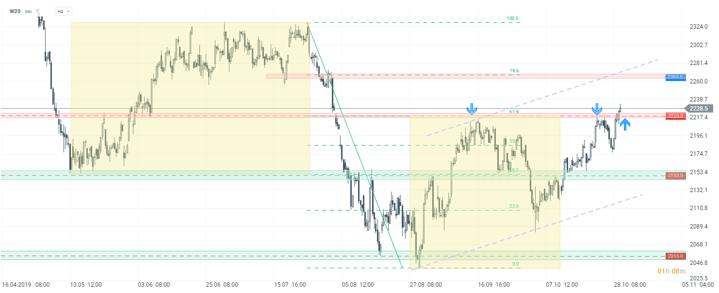Pomimo mieszanej sesji w Europie, polska giełda radzi sobie dość dobrze. Indeks WIG20 (W20) zdołał przebić się powyżej strefy oporu przy 2220 pkt. Na taki scenariusz wskazaliśmy we wczorajszym pulsie GPW. Aktualnie zgodnie z zasadą biegunowości poziom 2220 pkt powinien działać jako wsparcie, dopóki kurs znajduje się powyżej, istnieje szansa na ruch w kierunku 2265,5 pkt.