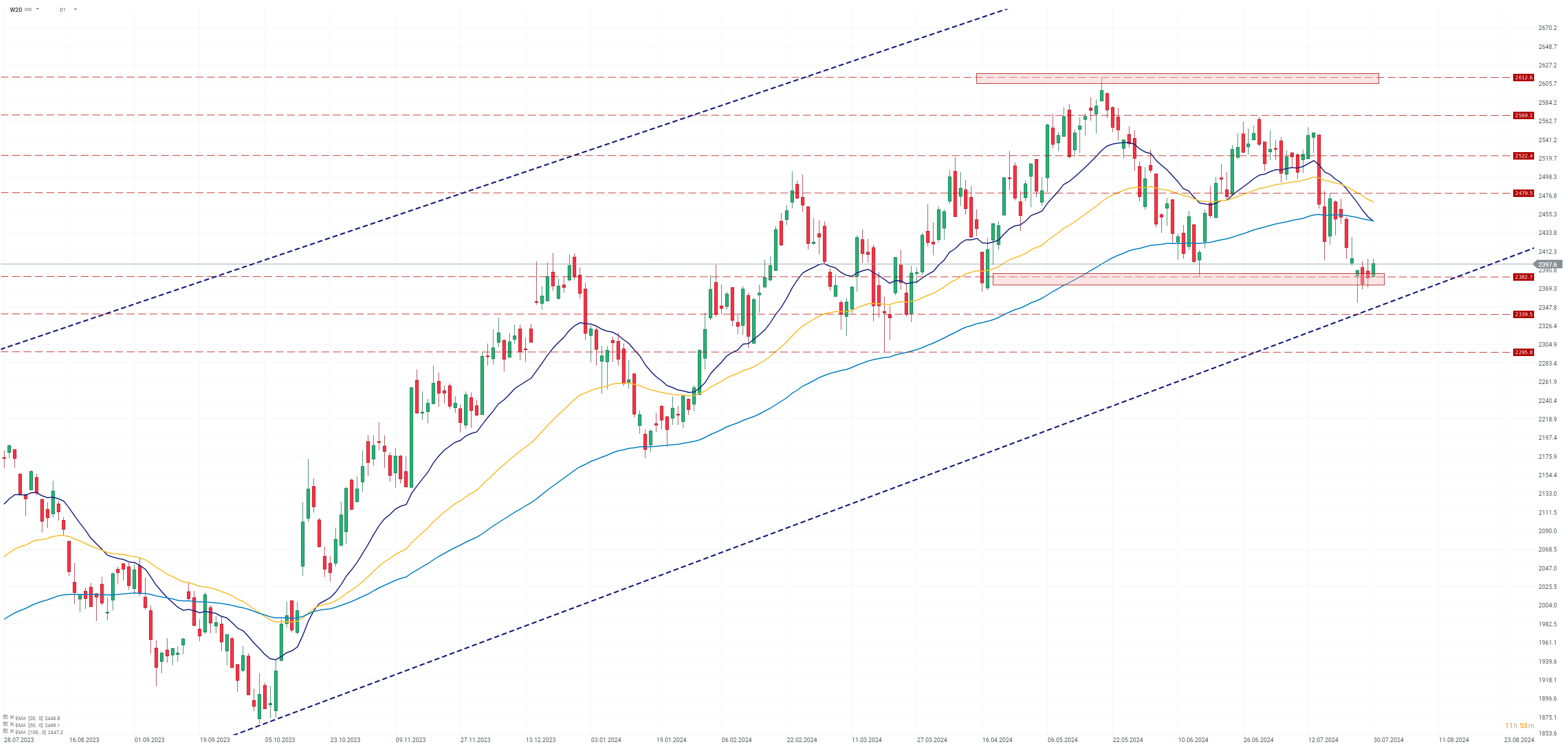 Kontrakt na indeks WIG20 (W20) notuje odbicie od strefy wsparcia w okolicach 2380 pkt. Ruch ten dalej nie jest na tyle mocny, by utwierdzić inwestorów w przekonaniu o trwałym obronieniu wsparcia, jednak w obliczu ostatnich spadków daje nadzieję na utrzymanie się notowań w kanale bocznym, a w dłuższym terminie utwierdzenie trendu wzrostowego. Źródło: xStation