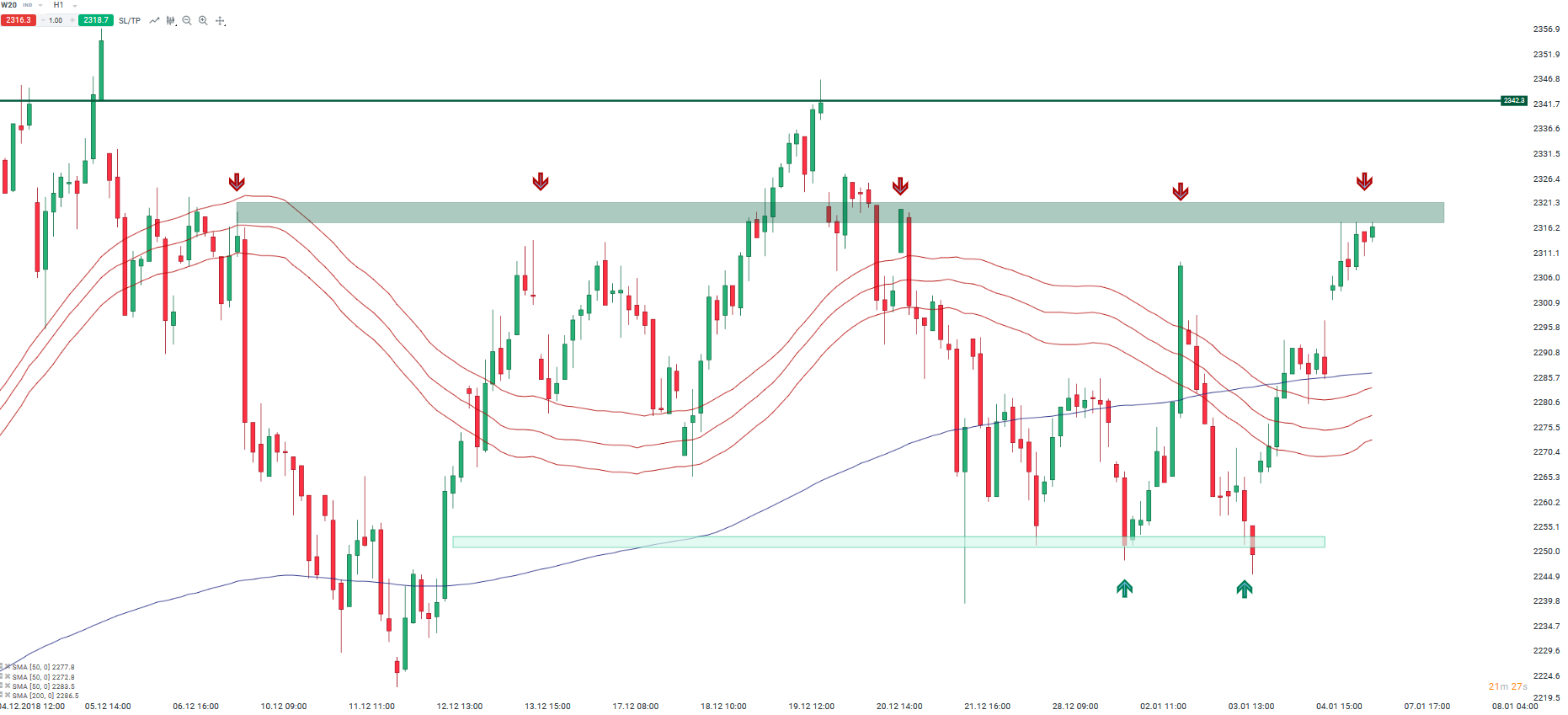 WIG20 (W20) pozostaje w konsolidacji pomiędzy 2250 pkt. a strefą 2320-2340 pkt. Źródło: xStation5.
