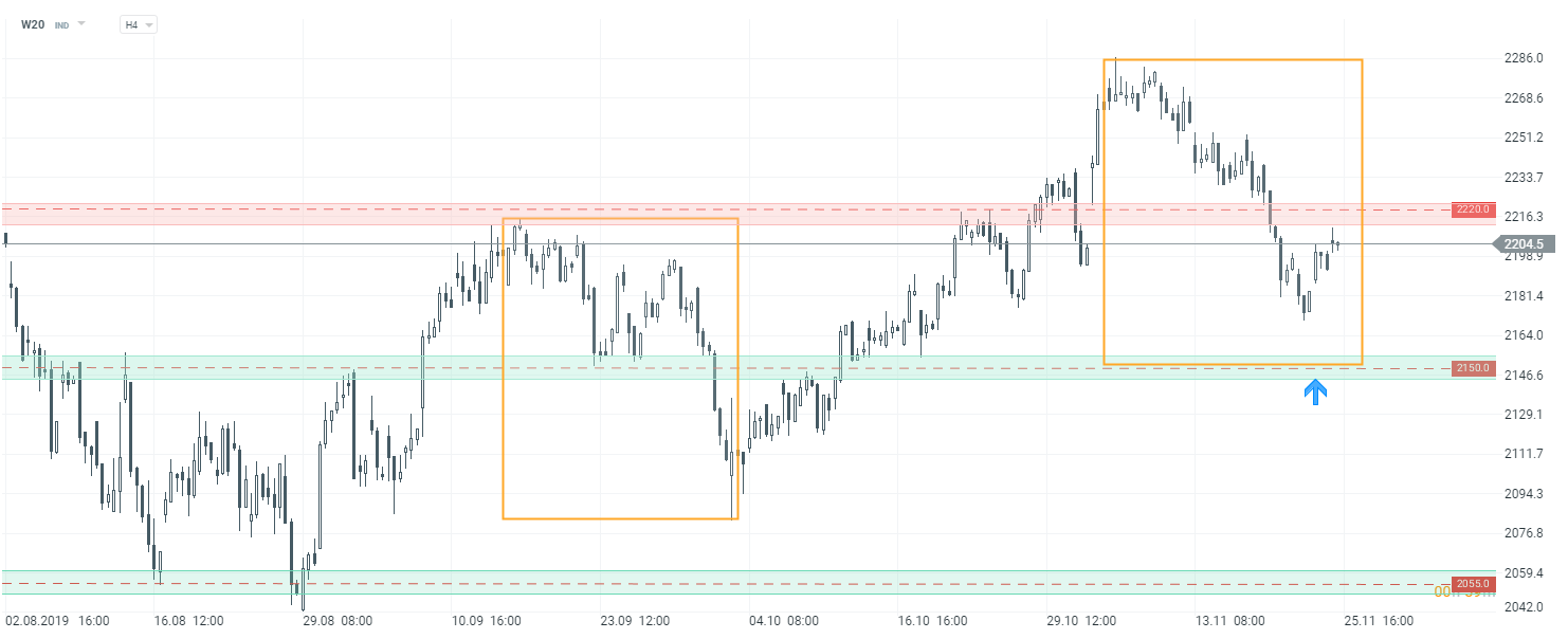 Dzisiejsza sesja na W20 rozpoczęła się od niewielkiej luki wzrostowej. Po otwarciu na wyższym poziomie, kurs raczej konsoliduje, w momencie przygotowywania artykułu wzrosty wynoszą 0,5%. Patrząc na wykres technicznie, sytuacja nie uległa większej zmianie, w dalszym ciągu kluczowe są dwie strefy. Wsparcie znajduje się w rejonach 2150 pkt, a opór wypada przy 2220 pkt. W20 interwał D1. Źródło: xStation