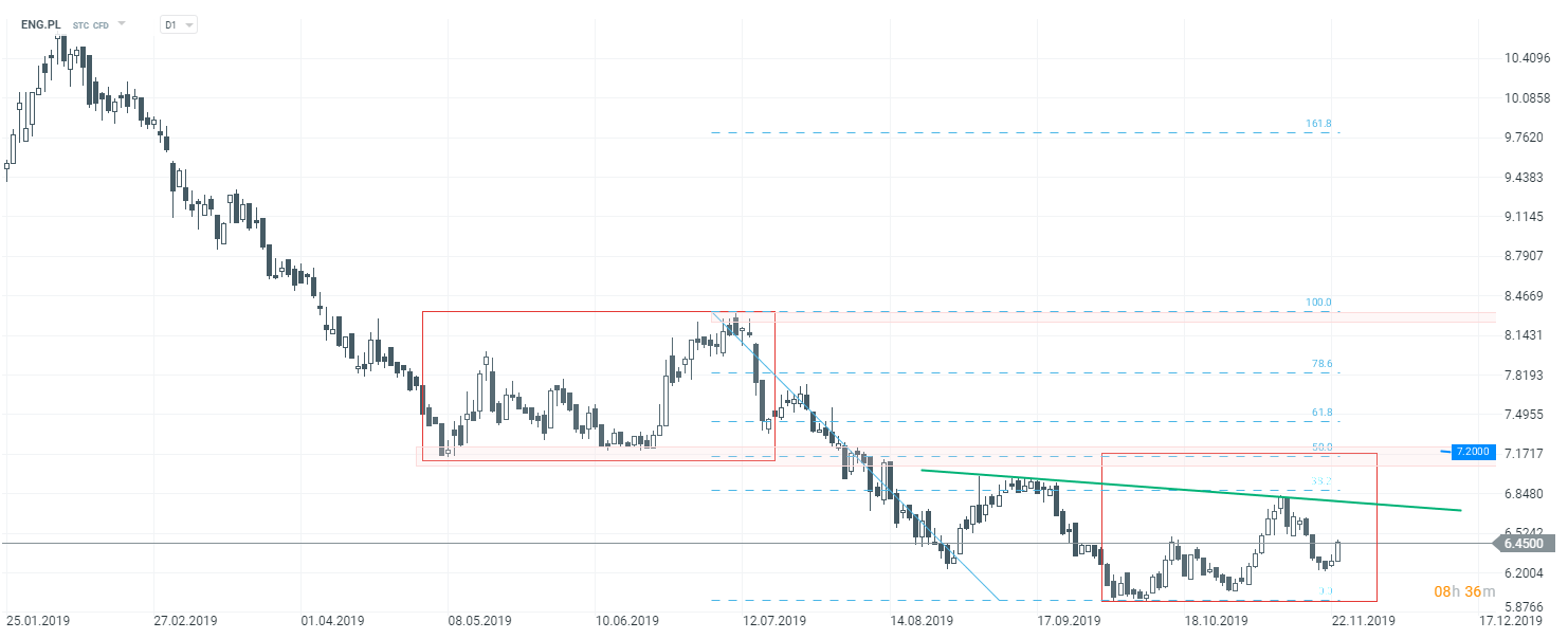 Najlepiej radzącą sobie dziś spółką z WIG30 jest Energa (ENG.PL). Jeszcze przed startem sesji w USA wzrosty wynoszą ponad 3%. W ostatnich dniach spółka poinformowała o uzyskaniu 8 mln euro dowfnansotania na testowanie nowych technologii, co jest pozytywną informacją. Niemniej patrząc na wykres, sytuacja nie wygląda tak różowo, spółka od dłuższego czasu znajduje się w trendzie spadkowym. Co prawda na interwale D1 widać pierwsze oznaki mogące sugerować większą korektę, niemniej aby do tego doszło, kurs musiałby wybić górą strefę oporu przy 7,2 zł. Wcześniej opór powinna stanowić takze linia poprowadzona po ostatnich lokalnych wierzchołkach - jest to zarazem linia szyi potencjalnej struktury oRGR, która może zapowiadać odwrócenie trendu.
