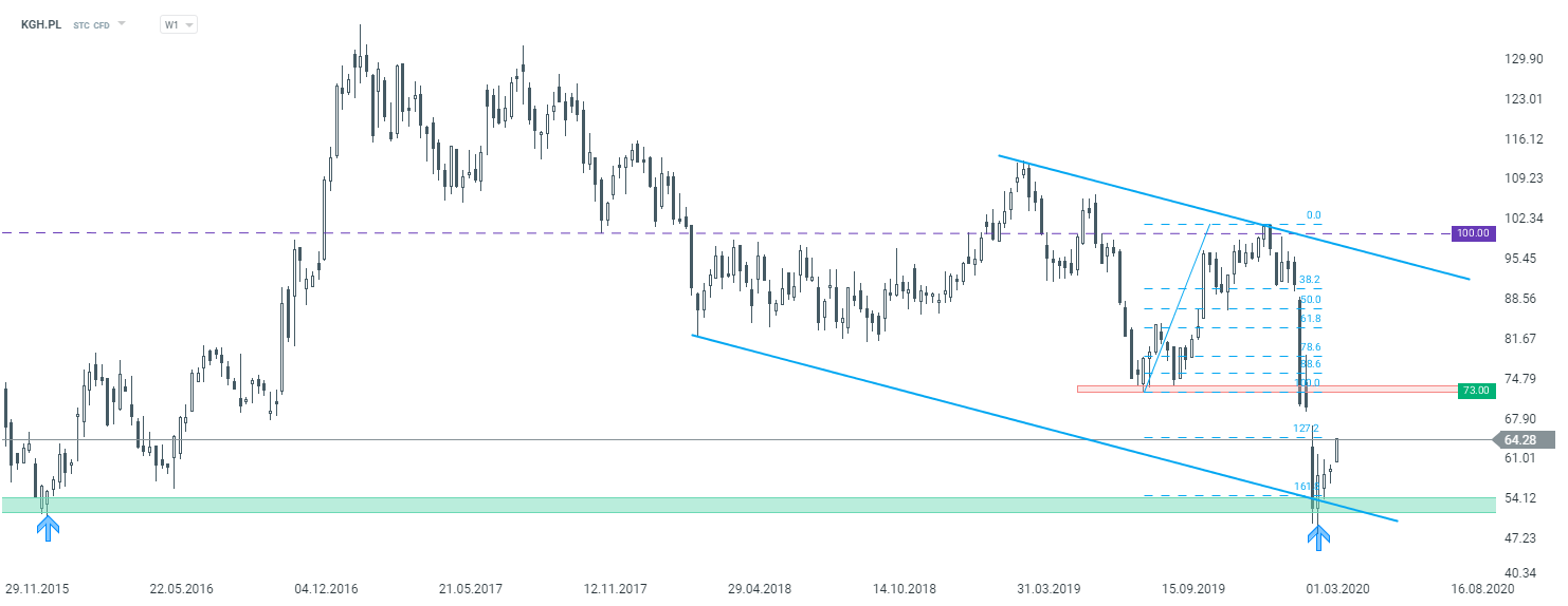 Jedną najlepiej radzących sobie dziś spółek z WIG20 jest KGHM, gdzie obserwujemy wzrosty na blisko 9%. Patrząc na interwał tygodniowy, w ostatnim czasie doszło do wyhamowania przeceny na wysokości kluczowego poziomu technicznego. Kupujący zdołali powstrzymać spadki w rejonach minimów z 2016 roku. Aktualnie testowane jest mierzenie zewnętrzne 127,2%, a jego wybicie górą może doprowadzić nawet do testu poziomu 73 zł. Wsparciem pozostaje strefa przy 53 zł.