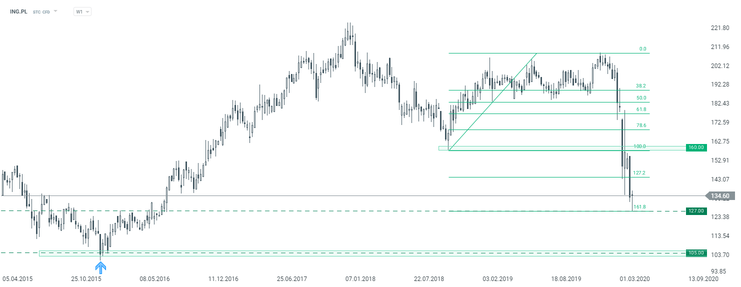 Sytuacja techniczna na spółce ING nie wygląda najlepiej. Pomimo, że kurs znajduje się dziś na niewielkim plusie, tak trend pozostaje silnie spadkowy, a zeszłotygodniowa świeca W1 nie zachęca do kupna. Z drugiej jednak strony, dzisiejsze tąpnięcie doprowadziło do testu ważnego mierzenia Fibonacciego - cena dotarła do współczynnika 161,8% ostatniej fali wzrostowej, gdzie pojawili się kupujący. Poziom 127 zł za akcję powinien być więc traktowany jako krótkoterminowe wsparcie. Jeżeli doszłoby do jego zanegowania, spadki mogą się pogłębić nawet w kierunku poziomu 105 zł.