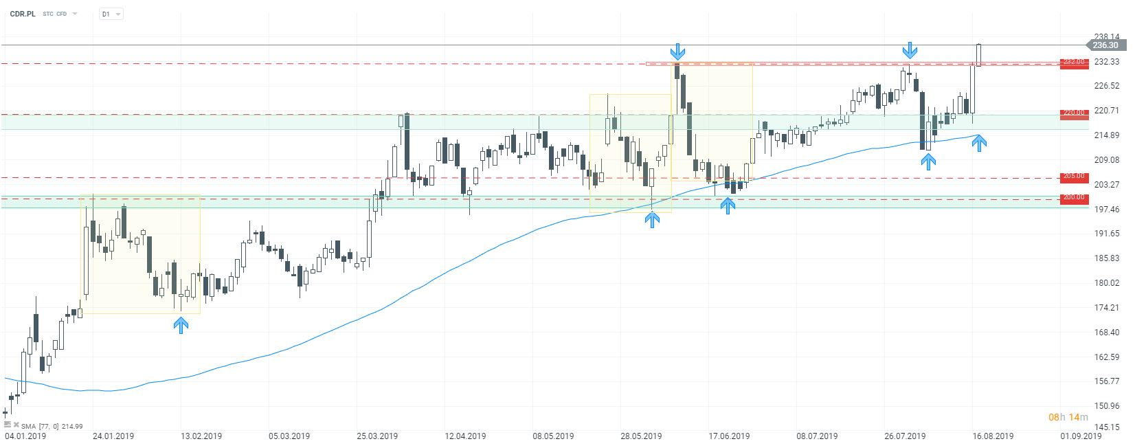 Jeśli chodzi o poszczególne spółki, warto przyjrzeć się sytuacji na CD Projekt. Być może skala wzrostów nie jest imponująca, niemniej doszło do wybicia historycznych maksimów. Wzrosty wynoszą dziś 2,12%, a za jedną akcję trzeba płacić ponad 236 złotych. Technicznie wszystko wskazywało na wybicie górą. Spółka od dłuższego czasu znajduje się w trendzie wzrostowym. Być może dynamika nieco spadła w ostatnich tygodniach, jednak to kupujący cały czas mieli przewagę. Cena kilka razy odbijała się od 77-okresowej średniej kroczącej, co w końcu doprowadziło do wybicia górą. Aktualnie możliwe jest cofnięcie, niemniej wybita strefa przy 232 zł powinna stanowić najbliższe wsparcie. Gdyby korekta spadkowa była większa, w dalszym ciągu istotna pozostaje także strefa przy 220 zł. Jeśli chodzi o szukanie szczytu, raczej nie należy tego robić w momencie tak wyraźnego trendu wzrostowego, aktualnie brakuje jakichkolwiek sygnałów podażowych.
