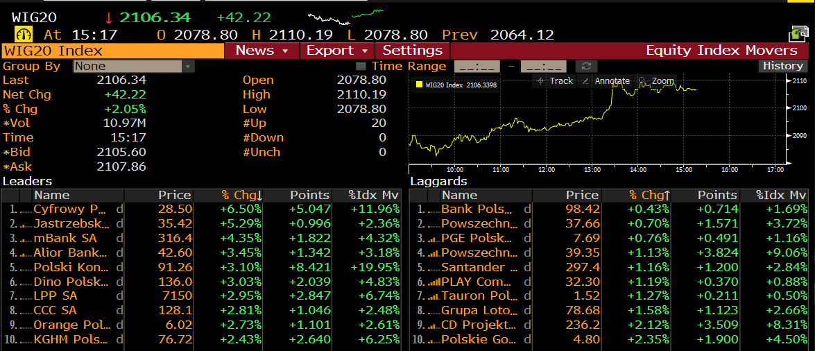 Początek tygodnia przynosi wyraźne wzrosty na rynku akcji. Pozytywne nastroje z sesji azjatyckiej udzielają się także w Europie. W momencie przygotowywania tego komentarza, tj. po godzinie 15:15, niemiecki indeks giełdowy rośnie ponad 1,5%. Wzrosty możemy obserwować także we Francji, gdzie CAC 40 zyskuje 1,44%. Nastroje są pozytywne i wróżą dobry początek sesji w Stanach Zjednoczonych. Patrząc na rodzimy parkiet, wszystkie polskie indeksy znajdują się na wyraźnym plusie. Indeks największych spółek rośnie ponad 2%, wszystkie 20 walorów znajduje się na plusie. Najwięcej zyskuje Cyfrowy Polsat, spółka notuje +6,2%. Spore wzrosty widać także na JSW (+5,6%) czy Mbanku (+4,5%). Solidne wzrosty notuje także WIG30, który rośnie 2,02%. Indeks WIG rośnie po godzinie 15:00 ponad 1,6%. Na blisko jedno procentowym plusie znajduje się także mWIG40, z kolei sWIG80 zyskuje 0,23%.