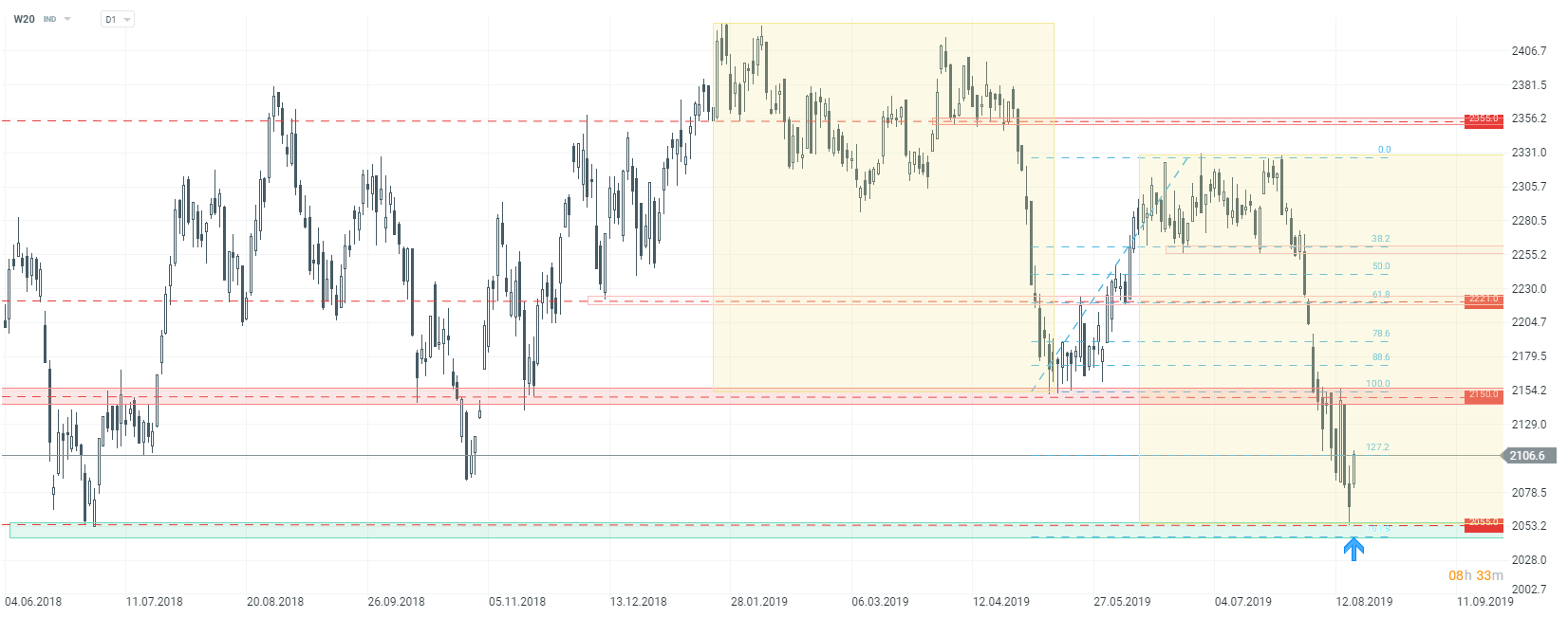 Patrząc technicznie na indeks W20, dzisiejsze odbicie nie jest przypadkowe. Cena dotarła w piątek do strefy wsparcia, o której wspominaliśmy wielokrotnie w poprzednich analizach. Wsparcie, o którym mowa wynika z kilku czynników. Przede wszystkim znajdują się tutaj historyczne dołki, chociażby minimum z czerwca 2018 roku. Dodatkowo należy zwrócić uwagę na współczynnik zewnętrzny 161,8% Fibonacciego, a także równość odcinków spadkowych, która została zaznaczona żółtymi prostokątami. Pomimo wyraźnego odbicia, należy jednak pamiętać, że trend jest w ostatnim czasie spadkowy. Kluczowym oporem pozostaje strefa przy 2150 pkt, i tak długo jak kurs znajduje się powyżej, obowiązuje tendencja zniżkująca. Dopiero wyjście powyżej tej strefy mogłoby doprowadzić do większych wzrostów.