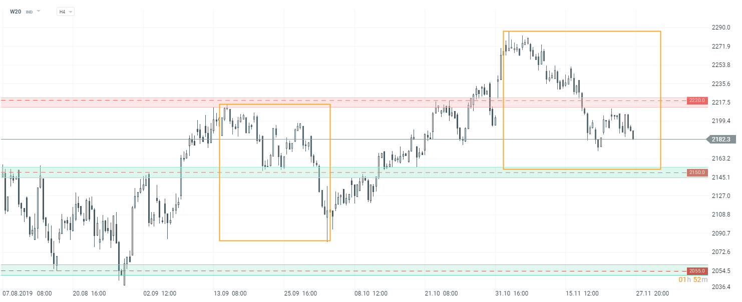 Przyglądając się jedynie indeksowi WIG20 (W20), ponownie możemy obserwować przecenę. Dzisiejszy dzień rozpoczął się w rejonach wczorajszego otwarcia, niemniej kolejne godziny przyniosły dalszy swobodny spadek. Kupujący pojawili się co prawda tuż po godzinie 10:00, jednak była to chwilowa reakcja, która została szybko stłumiona. Ostatecznie środa zakończyła się na minimach sesyjnych. Patrząc na wykres na interwale D1, kurs zmierza w kierunku minimów z 21 listopada. Tym samym szansa na zejście w kierunku wsparcia przy 2150 pkt staje się coraz bardziej prawdopodobne. Oporem pozostaje stefa przy 2220 pkt.