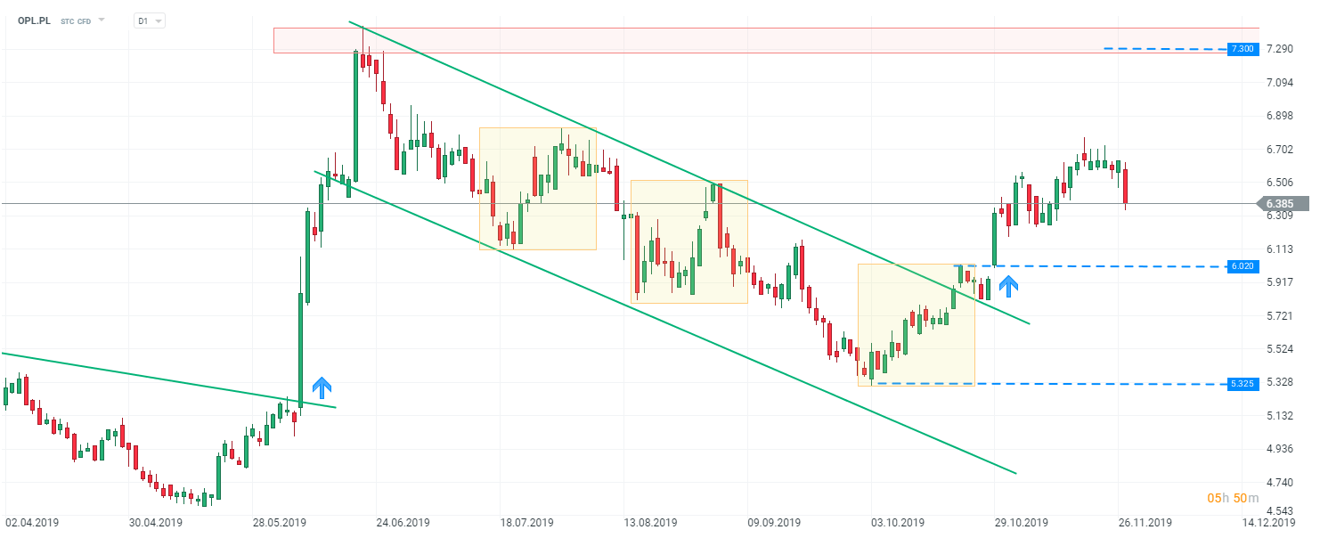 Najgorzej radzącą sobie dziś spółką była Orange Polska, spadki wyniosły na koniec sesji - 3,54%. Na rynku pojawiła się dziś informacja o możliwym połączeniu się grupy Deutsche Telekom z Orange . Wiadomość została podana przez niemiecki “Handelsblatt” oraz agencję Reuters. Według niemieckiego dziennika analizy odnośnie ewentualnego połączenia prowadzone przez Deutsche Telekom są na wczesnym etapie. Niemniej Orange zaprzeczyło tym doniesieniom, rzecznik spółki powiedział, że „nie ma ani myśli, ani dyskusji na ten temat”. Patrząc technicznie na wykres OPL.PL, dzisiejsze spadki należy traktować jako korektę w ruchu wzrostowym. Jeżeli ruch się pogłębi, to jako najbliższe wsparcie należy wziac pod uwagę poziom 6,02 zł. Strefa oporu kształtuje się z kolei dopiero przy 7,3 zł za jedną akcję.