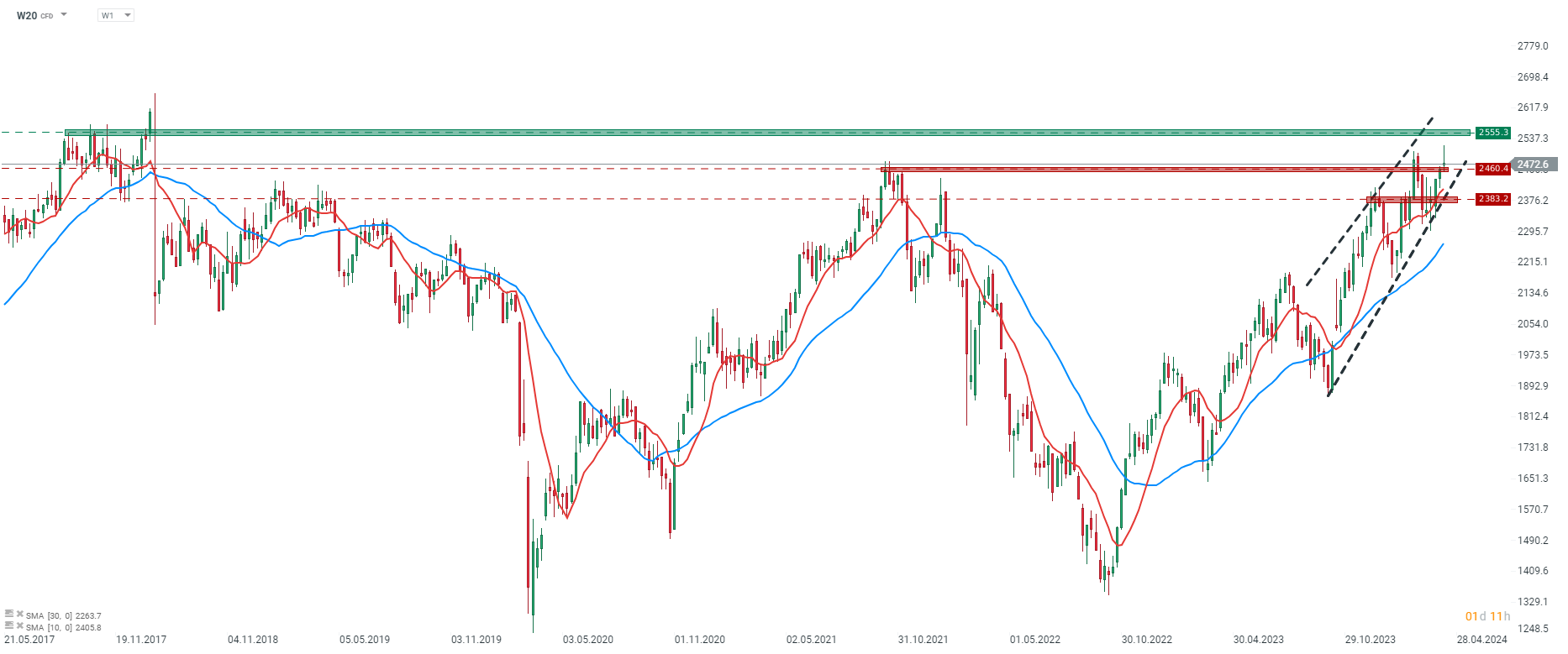 Kontrakt na indeks WIG20 (W20) w ujęciu tygodniowym walczy o utrzymanie przebicia linii oporu w granicach 2460,4 pkt. Poprzednie próby z lutego zakończyły się spadkami i powrotem notowań do poziomów wskaźnika SMA30. Sygnały z rynku nie wskazują na potencjał do mocnego spadku, dzięki czemu uprawdopodabnia się scenariusz zakończenia tygodnia na plusie, co stanowiłoby 5 tydzień z rzędu wzrostów kontraktu i utrzymanie się w kanale trendu wzrostowego zapoczątkowanego we wrześniu 2023 r. W przypadku utrzymania się w kolejnych tygodniach trendu i utwierdzeniu przebicia oporu 2460,4 pkt dostrzegamy następny mocny opór dopiero na poziomie 2555,3 pkt., wytyczony przez szczyty z czerwca 2017, którego wówczas próba przebicia skończyła się mocną przeceną kontraktu. Źródło: xStation
