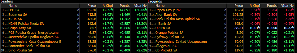 Po spadkach z wczorajszej sesji WIG20 zaczyna powoli odrabiać straty. Wzrosty indeksu podtrzymuje większość polskich blue chipów, wśród których przewodzi LPP (+2,72%) oraz Budimex (+1,93%). Po lekkim wczorajszym zastoju wzrosty kontynuuje także KGHM (+1,74%), podążając za ceną miedzi, które po dwóch dniach spadków znów powróciły na trajektorię wzrostową. W oczekiwaniu na dane banków z USA polski sektor finansowy łapie lekkie zatrzymanie. Za lekkim wzrostem całego indeksu WIG-Banki (+0,68%) nie podążyły czołowe banki z WIG20. Uwagę przykuwa także Pepco Group, które po solidnych wzrostach z wczoraj łapie lekką korektę.