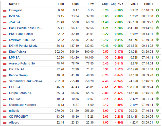Spółki wchodzące w skład indeksu WIG20 (W20) i ich największe zmiany procentowe w ujęciu dziennym. Źródło: Investing