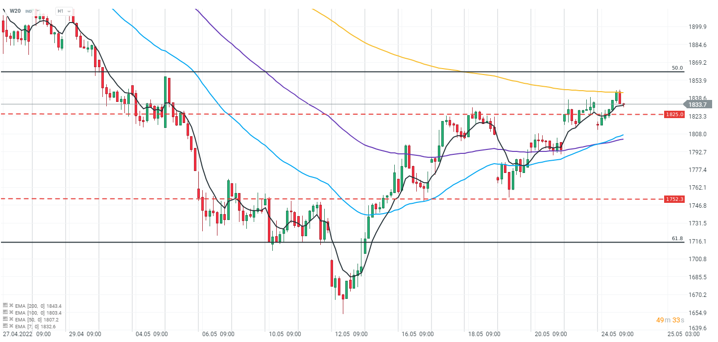 Wykres notowań indeksu W20, interwał H1. Polski benchmark akcji blue chip przetestował dzisiaj ograniczenie blisko 1845 punktów, po czym cofnął się w rejony wczorajszych zamknięć. Lokalnymi barierami pozostają wcześniej wspomniany poziom 1845 punktów (EMA 200, złota linia) oraz dzisiejsze low na poziomie 1816 punktów. Źródło: xStation 5