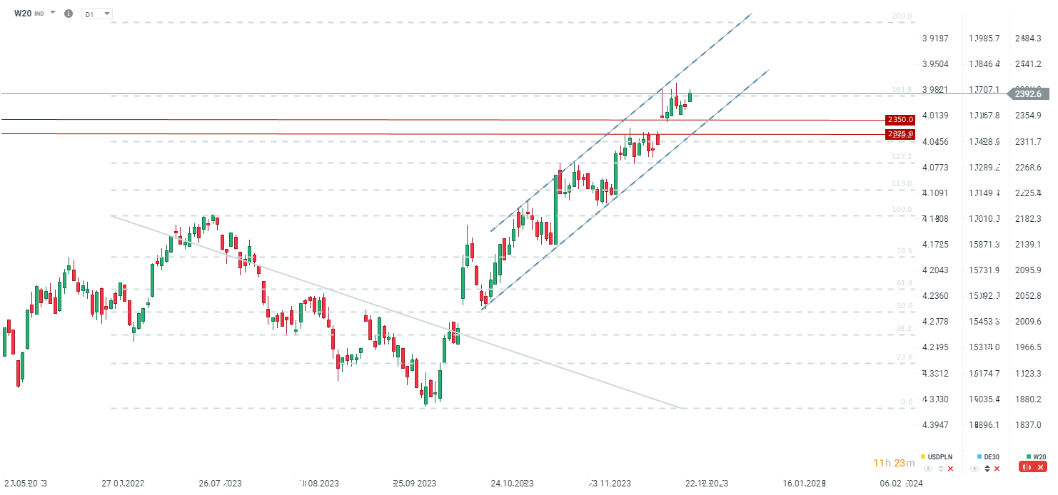 Kontrakt W20 zbliża się do poziomu 2400 punktów. Kontrakt miał problemy z przełamaniem tego poziomu w ostatnich dniach. Co ważniejsze kontrakt ma ok. 5% do ostatnich lokalnych szczytów z 2021 roku. Jeśli cena zamknie się przy obecnych poziomach, będzie to najwyższe zamknięcie kontraktu w tym roku. Jeśli jednak cena zamknie się poniżej zniesienia 161.8 poprzedniej dużej fali spadkowej, może dojść wtedy do wyznaczenia wyraźnej strefy podażowej poniżej 2400 punktów i spadku w kierunku górnego limitu ostatniej luki rolowania.