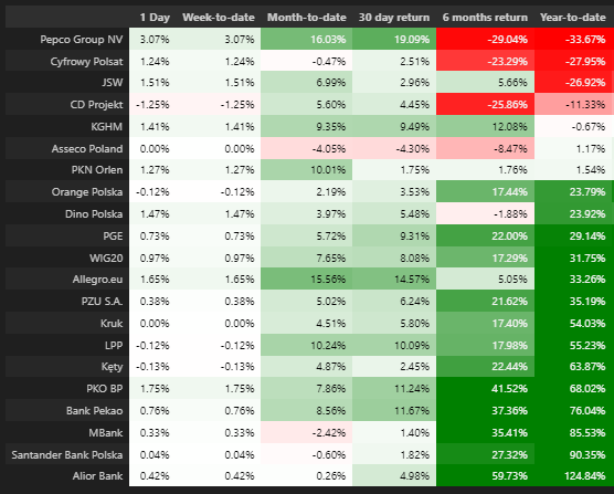 Rok zbliża się do końca, więc warto podsumować zmiany na poszczególnych spółkach. Sam indeks WIG20 zyskał niemal 32%, nieco więcej zyskała spółka detaliczna Allegro. Najlepiej miały się spółki finansowe, przede wszystkim banki, które zajmują pierwszą 5 pod względem zwrotów. Jedynie 5 spółek straciło na wartości i większe spadki zaliczyły 4. Pepco straciło ok. 33%, Cyfrowy Polsat stracił 28%, a JSW 27%. Warto jednak zauważyć, że w tym miesiącu mamy mocne odbicie Pepco i Cyfrowego Polsatu. Z drugiej strony 3 pierwsze banki, czyli Alior, Santander oraz Mbank nie miały się zbyt dobrze w ostatnim miesiącu, podczas gdy większość spółek zyskiwała. Widzimy, że dzisiaj zyskują spółki najmocniej tracące w tym roku, co może się nieco kłócić z tzw. optymalizacją podatkową, podczas której najgorsze spółki tracą również na końcu roku, ale zyskują już wyraźnie na początku nowego, ze względu na odkupowanie spółek do portfeli.