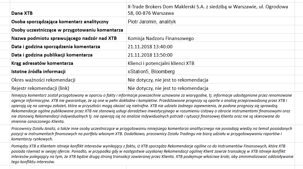Ta publikacja handlowa jest informacyjna i edukacyjna. Nie jest rekomendacją inwestycyjną ani informacją rekomendującą lub sugerującą strategię inwestycyjną. W materiale nie sugerujemy żadnej strategii inwestycyjnej ani nie świadczymy usługi doradztwa inwestycyjnego. Materiał nie uwzględnia indywidualnej sytuacji finansowej, potrzeb i celów inwestycyjnych klienta. Nie jest też ofertą sprzedaży ani subskrypcji. Nie jest zaproszeniem do nabycia, reklamą ani promocją jakichkolwiek instrumentów finansowych. Publikację handlową przygotowaliśmy starannie i obiektywnie. Przedstawiamy stan faktyczny znany autorom w chwili tworzenia dokumentu. Nie umieszczamy w nim żadnych elementów oceniających. Informacje i badania oparte na historycznych danych lub wynikach oraz prognozy nie stanowią pewnego wskaźnika na przyszłość. Nie odpowiadamy za Twoje działania lub zaniechania, zwłaszcza za to, że zdecydujesz się nabyć lub zbyć instrumenty finansowe na podstawie informacji z tej publikacji handlowej. Nie odpowiadamy też za szkody, które mogą wynikać z bezpośredniego czy też pośredniego wykorzystania tych informacji. Inwestowanie jest ryzykowne. Inwestuj odpowiedzialnie.