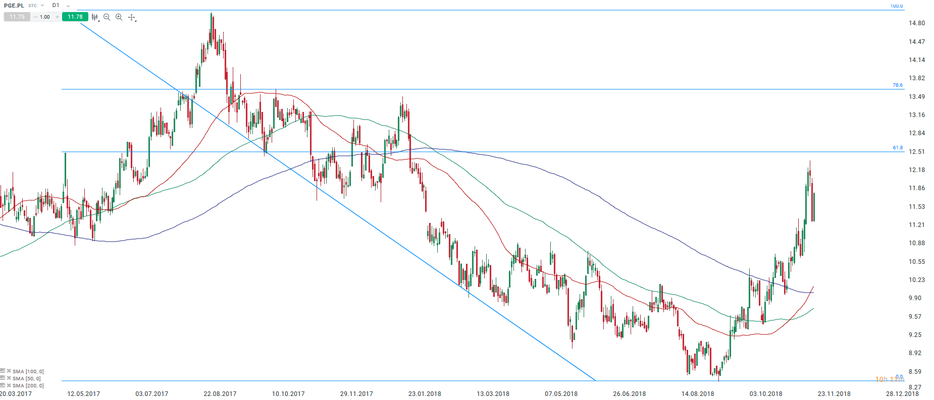 Z kolei wieczorem podano również wyniki pierwszej aukcji mocy, która na dostawy energii na 2021 rok zakończyła się w 5 rundzie z ceną 240,32 zł/kW/rok (górny przedział podawany w czwartek to 218,56-240,4 PLN/kWh). Budżet projektu wyniósł 5,4 mld złotych wobec oczekiwanych wcześniej 3-4 mld złotych. Po tych informacjach duże spółki energetyczne odbijają i zakontraktowały one od 50-70% swoich całkowitych mocy. Kolejne aukcje mocy (na 2022 i 2023) odbędą się odpowiednio 5 i 21 grudnia 2018.