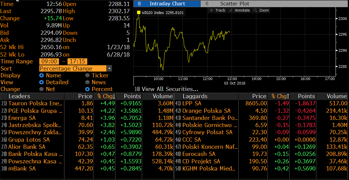 Środa przynosi odwilż na europejskich parkietach po zapowiedziach włoskiego rządu o ustaleniu docelowego deficytu budżetowego na rok 2020 i 2021 roku do poziomów odpowiednio: 2,2% i 2% PKB. Warto przypomnieć, że wcześniejsze zawirowania wywarły dużą presję na notowania euro i rynków akcji w Europie. Po początkowych wzrostach na giełdach obserwowaliśmy jednak szybkie cofnięcie, które pokryło się ze wzrostem rentowności 10-letnich rentowności włoskich obligacji do wczorajszych poziomów oraz osłabieniem euro. Trzeba pamiętać, że dzisiejsza sesja odbywa się bez obecności niemieckich inwestorów, co jest szczególnie widoczne na Książęcej. Na ponad dwie godziny przed startem sesji na Wall Street, kontrakty na amerykańskie indeksy wskazują na wyższe otwarcie, co powinno wspomagać europejski rynek w drugiej fazie sesji na Starym Kontynencie.