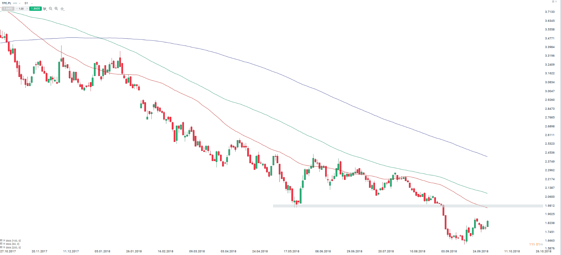 Najmocniejszą branżą na całej giełdzie dzisiaj jest energetyka. Spółki energetyczne w ostatnich miesiącach pozostawały pod silną presją. Jednym z powodów był mocny wzrost uprawnień do emisji CO2 (EMISS), ponieważ polski miks energetyczny jest w 80% oparty na węglu. Druga połowa września przyniosła jednak stabilizację cen uprawnień, a również na polskim horyzoncie pojawiła się iskierka nadziei, że kolejne miesiące mogą okazać się łaskawsze dla branży energetycznej. Rynek obecnie spekuluje na temat podwyżki przez URE taryfy G dla gospodarstw domowych w związku z rosnącymi cenami energii elektrycznej. Oczywiste wydaje się, że akcjonariusz dominujący będzie w dalszym ciągu bronił bezpieczeństwa energetycznego kraju, lecz w związku z zakończeniem pewnego etapu inwestycyjnego może dojść do zmiany retoryki, co może być jednym z elementów trwającego odbicia.