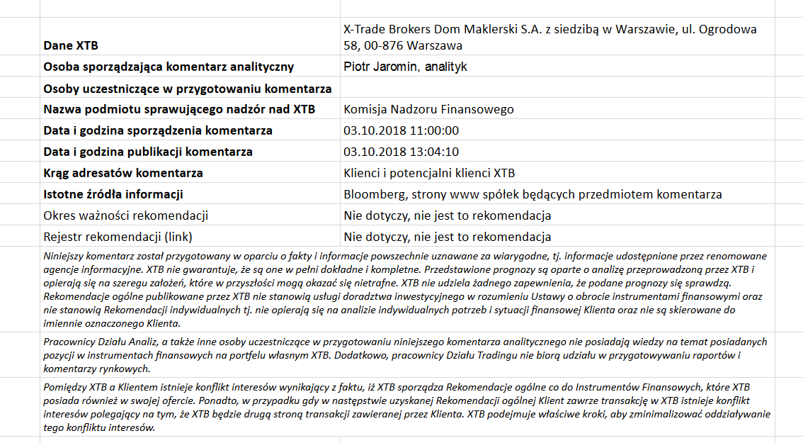 Ta publikacja handlowa jest informacyjna i edukacyjna. Nie jest rekomendacją inwestycyjną ani informacją rekomendującą lub sugerującą strategię inwestycyjną. W materiale nie sugerujemy żadnej strategii inwestycyjnej ani nie świadczymy usługi doradztwa inwestycyjnego. Materiał nie uwzględnia indywidualnej sytuacji finansowej, potrzeb i celów inwestycyjnych klienta. Nie jest też ofertą sprzedaży ani subskrypcji. Nie jest zaproszeniem do nabycia, reklamą ani promocją jakichkolwiek instrumentów finansowych. Publikację handlową przygotowaliśmy starannie i obiektywnie. Przedstawiamy stan faktyczny znany autorom w chwili tworzenia dokumentu. Nie umieszczamy w nim żadnych elementów oceniających. Informacje i badania oparte na historycznych danych lub wynikach oraz prognozy nie stanowią pewnego wskaźnika na przyszłość. Nie odpowiadamy za Twoje działania lub zaniechania, zwłaszcza za to, że zdecydujesz się nabyć lub zbyć instrumenty finansowe na podstawie informacji z tej publikacji handlowej. Nie odpowiadamy też za szkody, które mogą wynikać z bezpośredniego czy też pośredniego wykorzystania tych informacji. Inwestowanie jest ryzykowne. Inwestuj odpowiedzialnie.