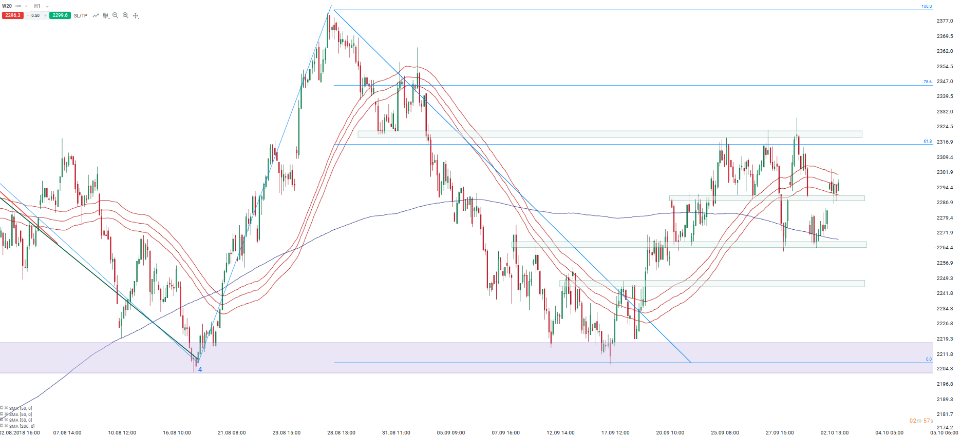 W20 wybronił poranną lukę hossy i obecnie ponownie kieruje się w kierunku dzisiejszych maksimów. Obrona 2285 pkt. sugeruje możliwy test 2320 pkt. w najbliższych godzinach handlowych, w szczególności, że pozytywne notowania kontraktów amerykańskich dają powody ku próbie ataku na historyczne maksima za oceanem. Źródło: xStation5.