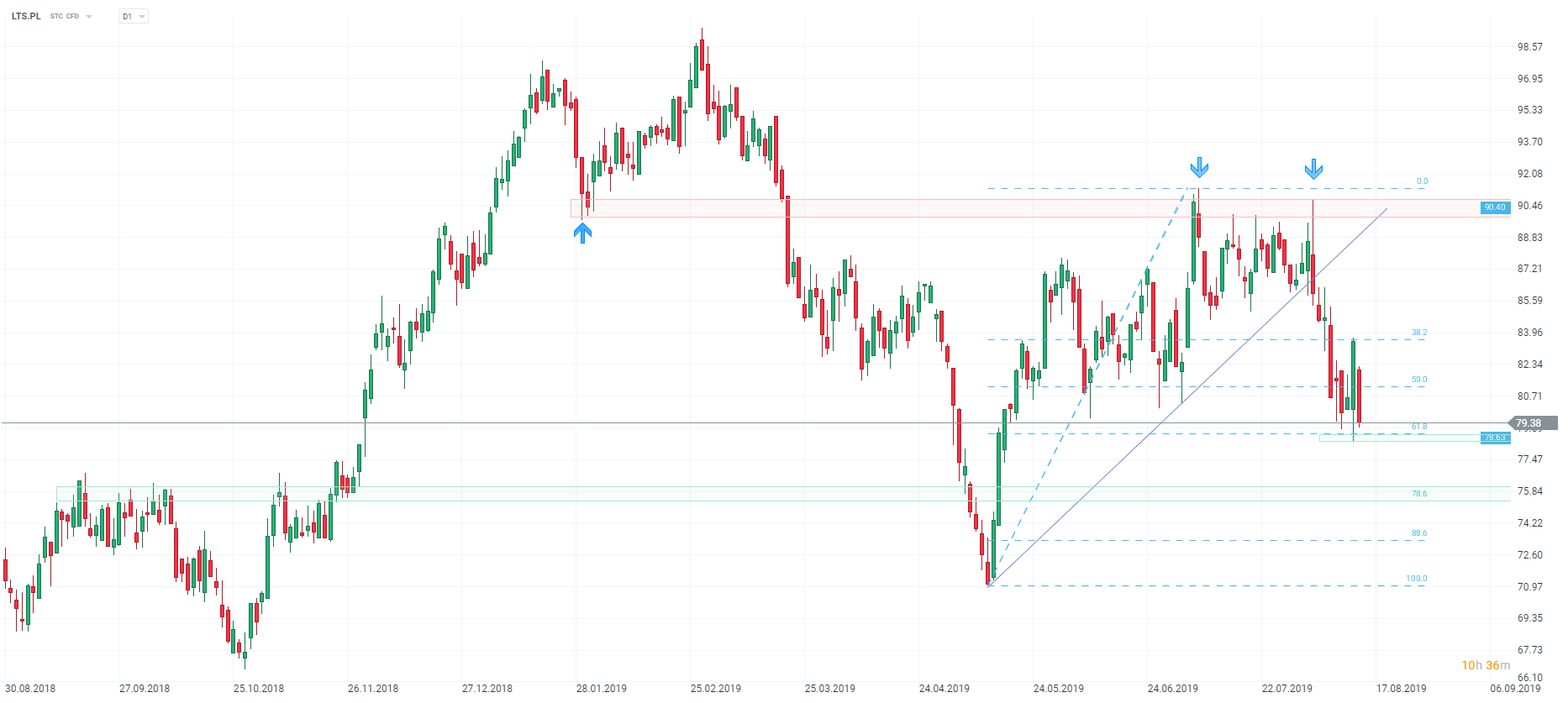 Jeśli chodzi o poszczególne spółki, zobaczmy jak wygląda sytuacja techniczna na Lotosie (LTS.PL). Wtorkowa sesja zakończyła się na sporym plusie, niemniej środa rozpoczęła się od wyraźnej luki spadkowej. W kolejnych godzinach ruch w dół jest kontynuowany. Notowania zbliżają się do wczorajszych minimów, które stanowią kluczowe wsparcie. W przypadku pokonania poziomu 78,6 zł, gdzie znajduje się mierzenie 61,8%, spadki mogą się pogłębić do kolejnego współczynnika Fibonacciego -78.6%. W tym miejscu znajdują się również kluczowe poziomy z 2018 roku, co wpływa na wzmocnienie strefy wsparcia.