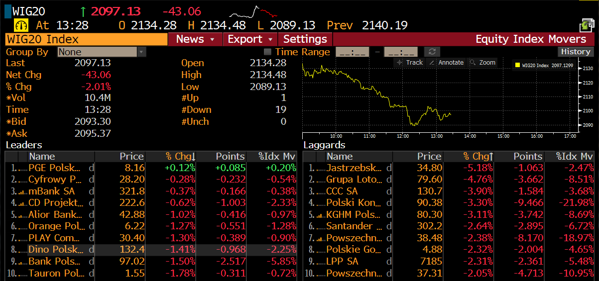 Koniec wczorajszej sesji był zdominowany przez informacje dotyczące ocieplenia relacji na linii USA - Chiny. Po godzinie 15:30 wszystkie światowe indeksy ruszyły w górę, dzień zamknął się na maksimach sesyjnych. Podobnie było na GPW, gdzie indeks WIG20 zakończył na +1.44%. Niemniej euforia nie trwała długo. Dzisiejsza sesja przynosi powrót do smutnej rzeczywistości. Po godzinie 13:00 indeks 20-stu największych spółek traci ponad 2%! Kolor czerwony dominuje, z całego indeksu na plusie znajduje się tylko PGE, reszta spółek wyraźnie traci. Największe spadki notuje JSW SA, która notuje spada ponad 5%.
